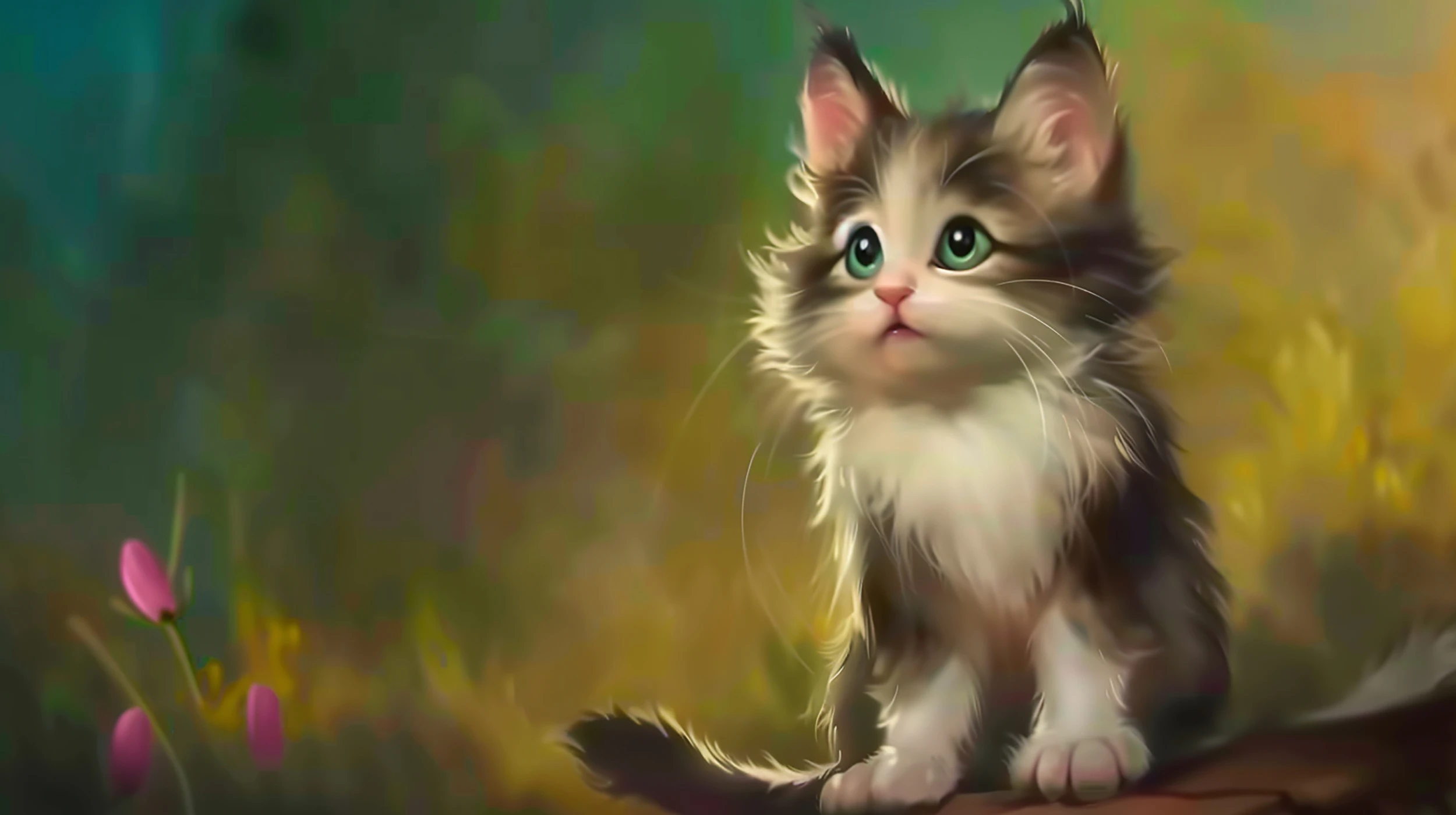 Ce papier peint animalier révèle un adorable petit chat aux tons chauds et naturels, magnifiquement mis en scène dans un univers artistique digital. Le félin, au pelage brun et crème délicatement nuancé, se détache sur un arrière-plan flou aux teintes vertes émeraude et dorées. Ses grandes oreilles pointues et son expression attendrissante créent une atmosphère de pure douceur. Quelques touches florales roses viennent ponctuer harmonieusement cette composition, rappelant les fleurs sauvages d’une prairie printanière. La technique de peinture numérique confère à l’ensemble un rendu à la fois réaliste et féerique, où chaque détail de la fourrure soyeuse semble vibrer de vie.