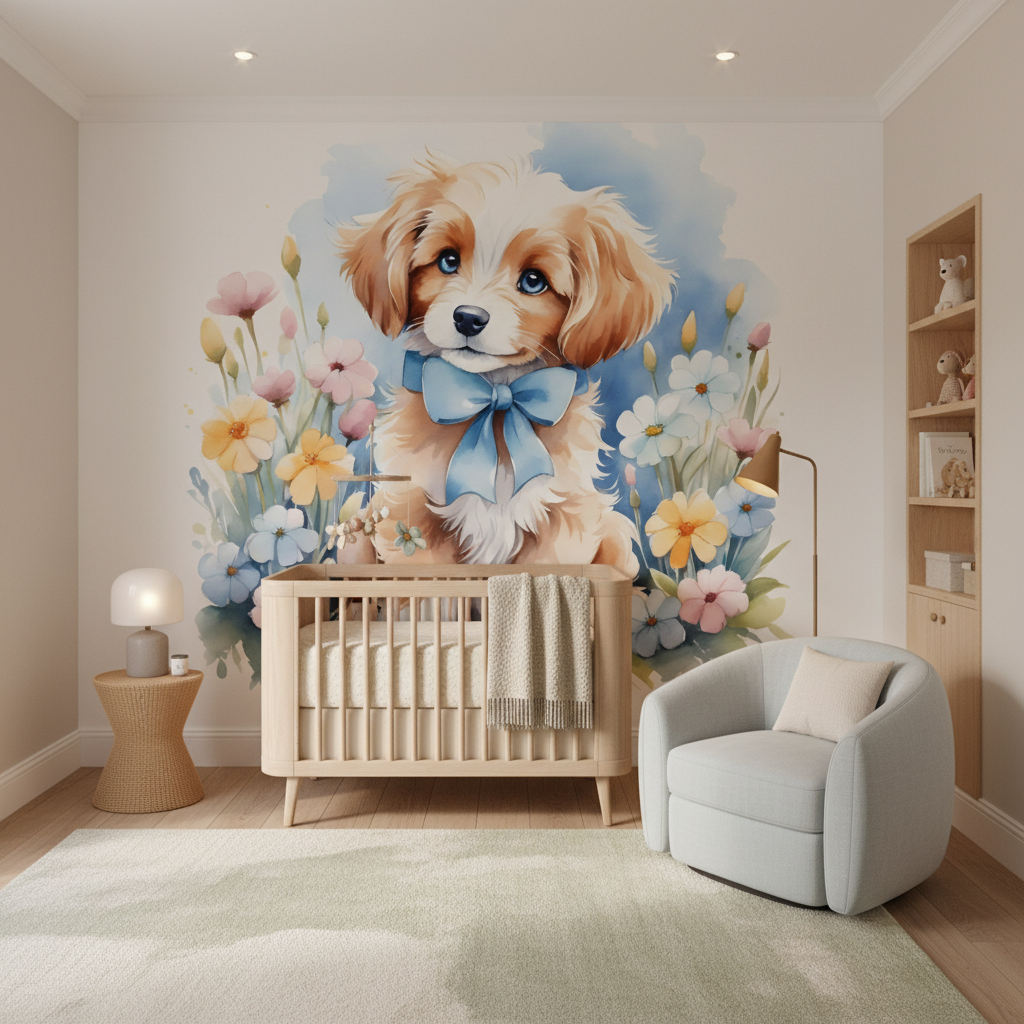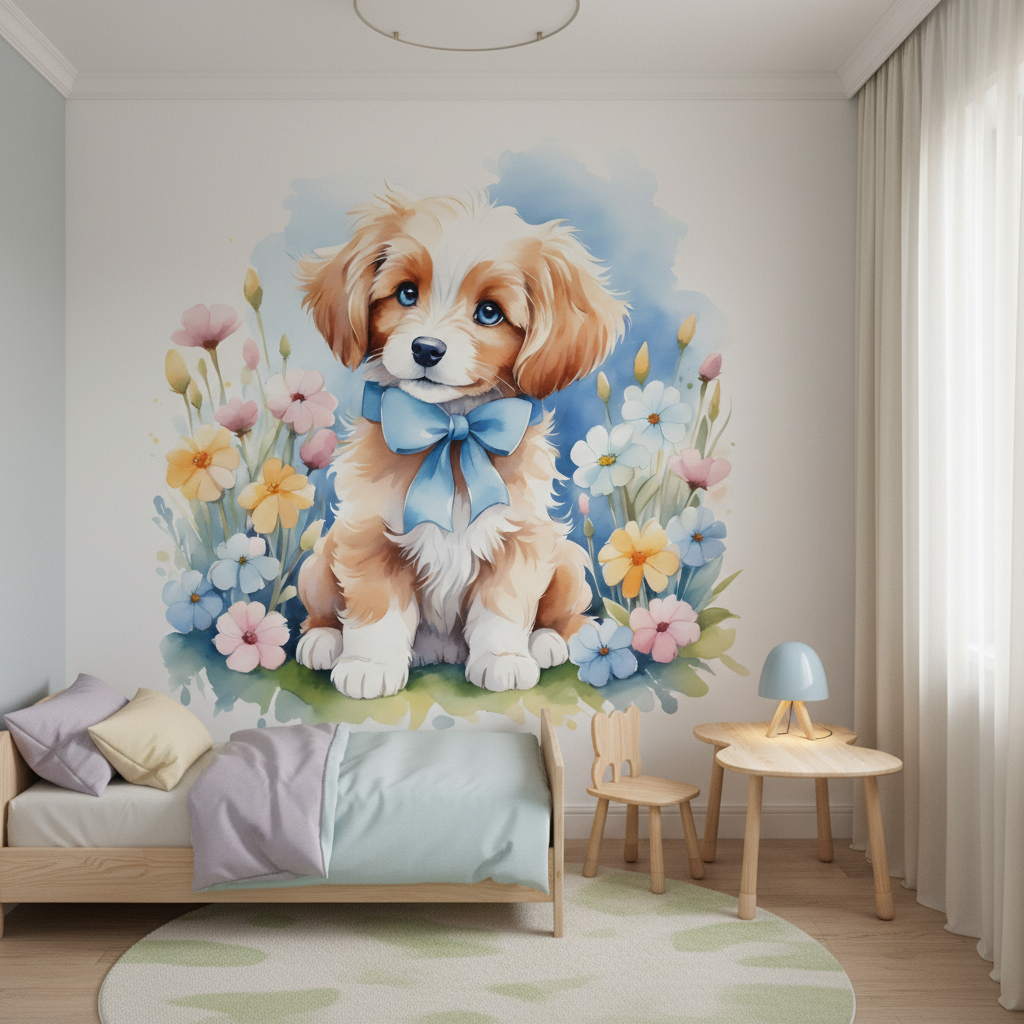 Ce papier peint enfant dégage une atmosphère apaisante et joyeuse, parfaite pour créer un cocon de tendresse et de sérénité. L’expression bienveillante du chiot et la palette de couleurs douces transforment instantanément l’espace en un refuge chaleureux et réconfortant. Cette ambiance féerique et poétique invite à la détente et stimule l’imagination, créant un environnement propice aux rêves les plus beaux.