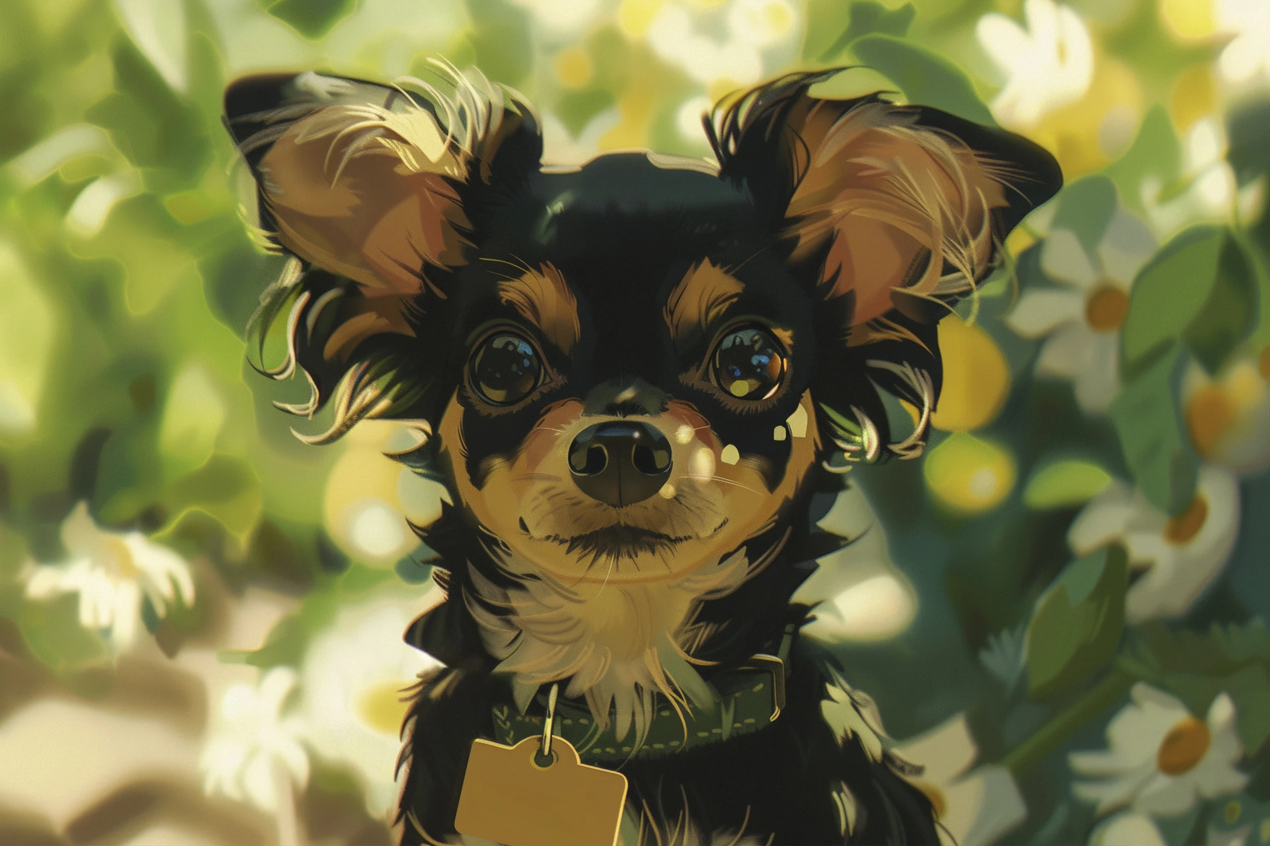 Ce papier peint chiot artistique révèle le portrait saisissant d’un adorable petit compagnon aux oreilles dressées et aux yeux pétillants d’intelligence. Le style graphique peint adopte une technique picturale raffinée, mêlant réalisme et sensibilité artistique pour créer une œuvre murale d’exception. Les tons chauds naturels dominent la composition : le pelage soyeux décline des nuances de brun caramel, de noir profond et de beige doré, tandis que l’arrière-plan se pare de verts tendres et de jaunes lumineux évoquant une végétation printanière baignée de soleil.