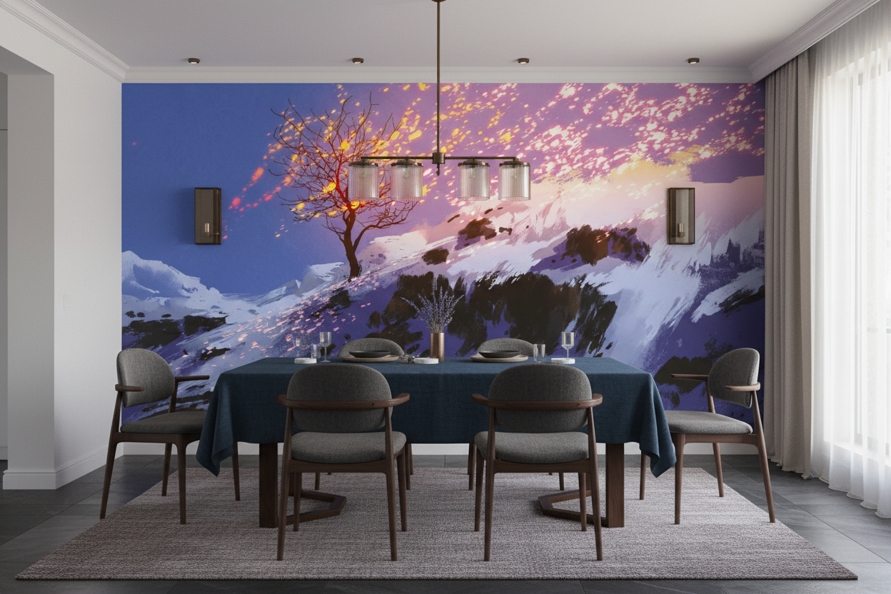 Papier Peint Arbre Enflammé – Paysage Montagnard Fantastique