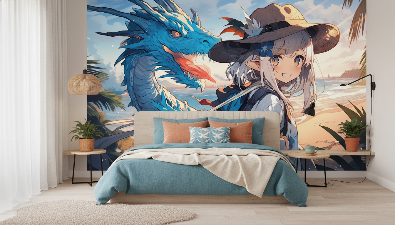 Évadez-vous avec notre papier peint anime sur mesure. Dragon bleu, aventurière et plage tropicale au coucher du soleil. Transformez chambre ado ou salon en un univers fantastique et unique.
