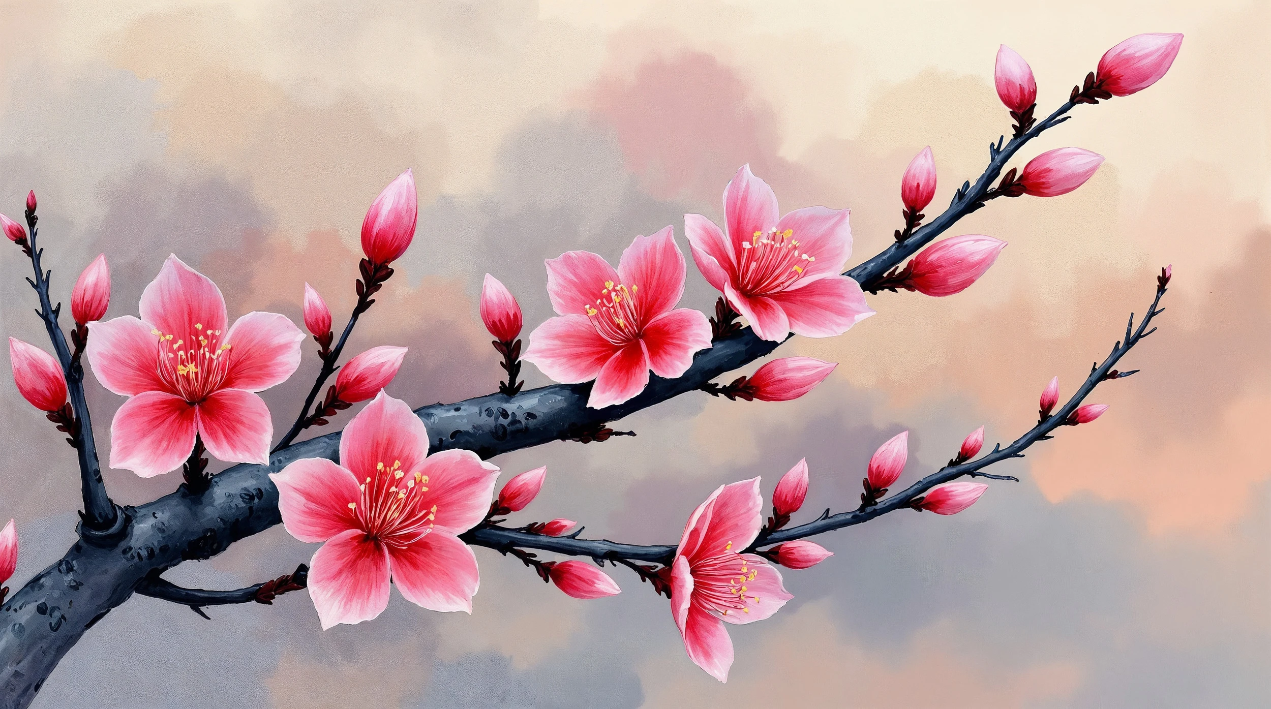 Cette composition aquarellée révèle une branche de cerisier aux contours sombres et texturés, d’où s’épanouissent des fleurs de sakura aux teintes rosées sublimes. Les pétales délicats se parent de dégradés allant du blanc nacré au rose fuchsia, tandis que les boutons floraux en devenir promettent une éclosion perpétuelle. Les étamines dorées apportent une touche précieuse qui illumine chaque corolle, créant un contraste saisissant avec les branches d’un noir profond. L’arrière-plan vaporeux, aux tons poudrés de beige et de mauve, évoque la douceur d’un ciel au crépuscule, conférant à l’ensemble une dimension onirique et apaisante.