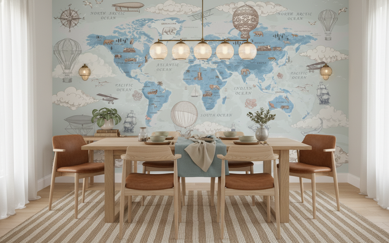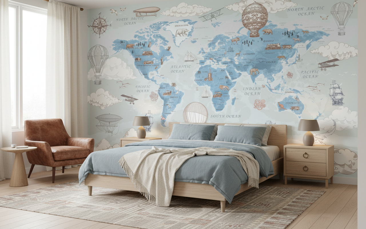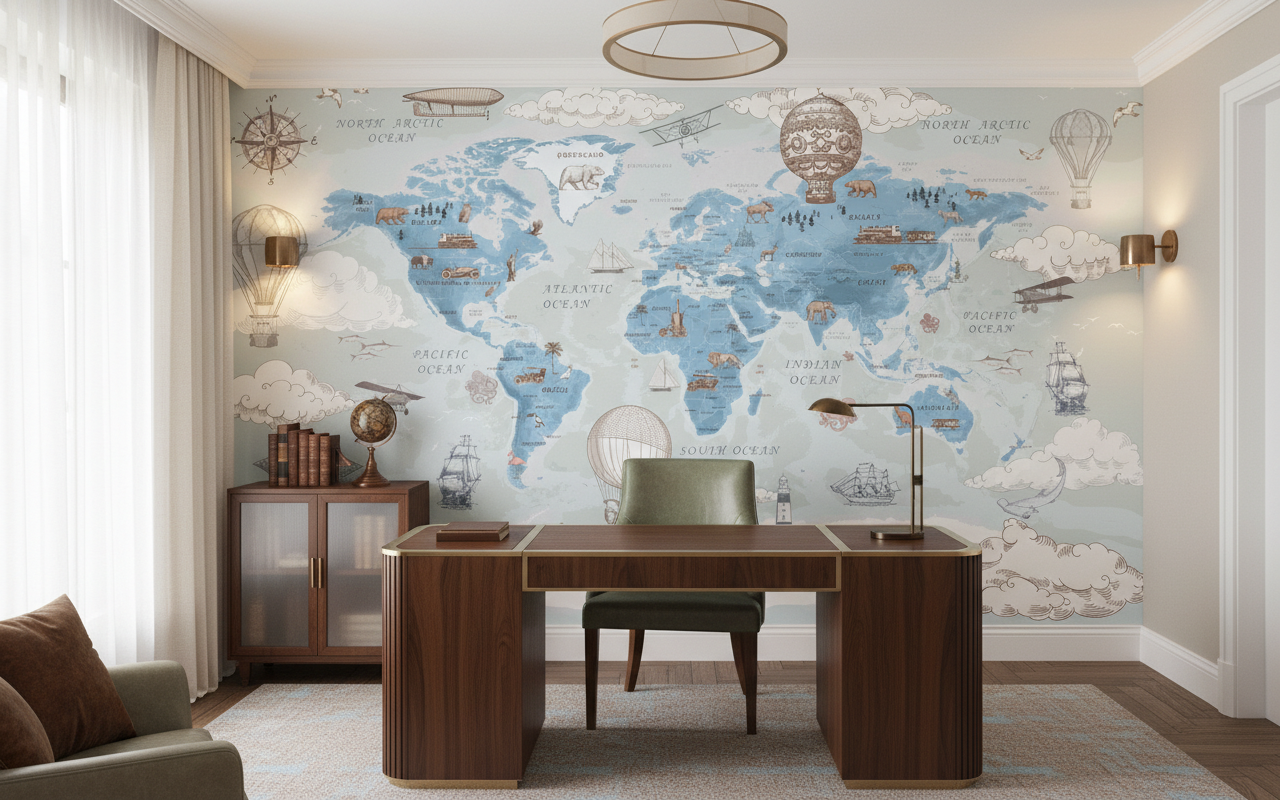 Ce papier peint pour salon trouve naturellement sa place dans un bureau d’inspiration, transformant l’espace de travail en cabinet de curiosités moderne. Dans une chambre d’enfant, il stimule l’imagination et l’apprentissage géographique. Pour un salon contemporain, associez-le à des meubles en bois naturel, des textiles en lin écru et des accessoires en laiton vieilli. Les teintes terracotta et les verts olive créeront des accords parfaits avec cette palette poudrée.