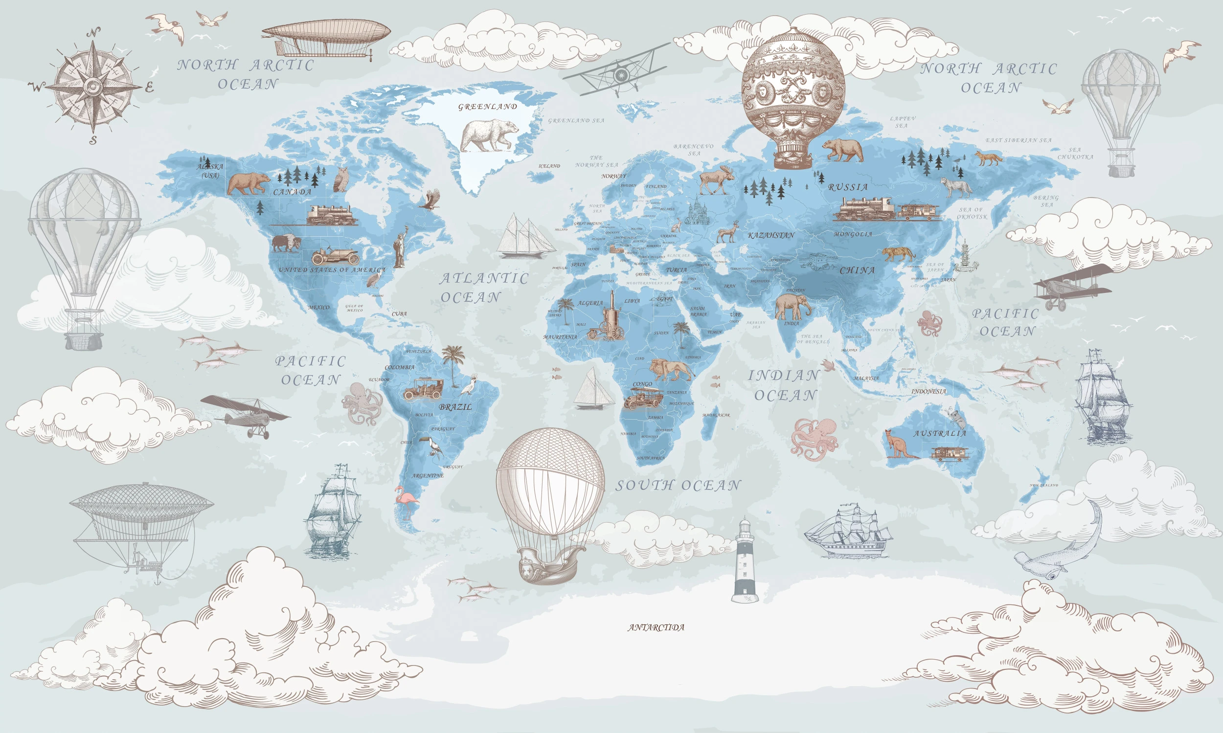 Le style graphique s’inspire des cartes d’exploration anciennes et des récits de voyage du XIXe siècle. Chaque continent s’enrichit d’une faune emblématique finement illustrée : ours polaires majestueux du Groenland, éléphants d’Afrique, kangourous d’Australie, et pandas d’Asie. Les océans s’animent de baleines gracieuses et de voiliers d’époque, tandis que les montgolfières vintages et les dirigeables rétro naviguent entre les nuages poudrés, apportant une dimension poétique et aérienne à l’ensemble.