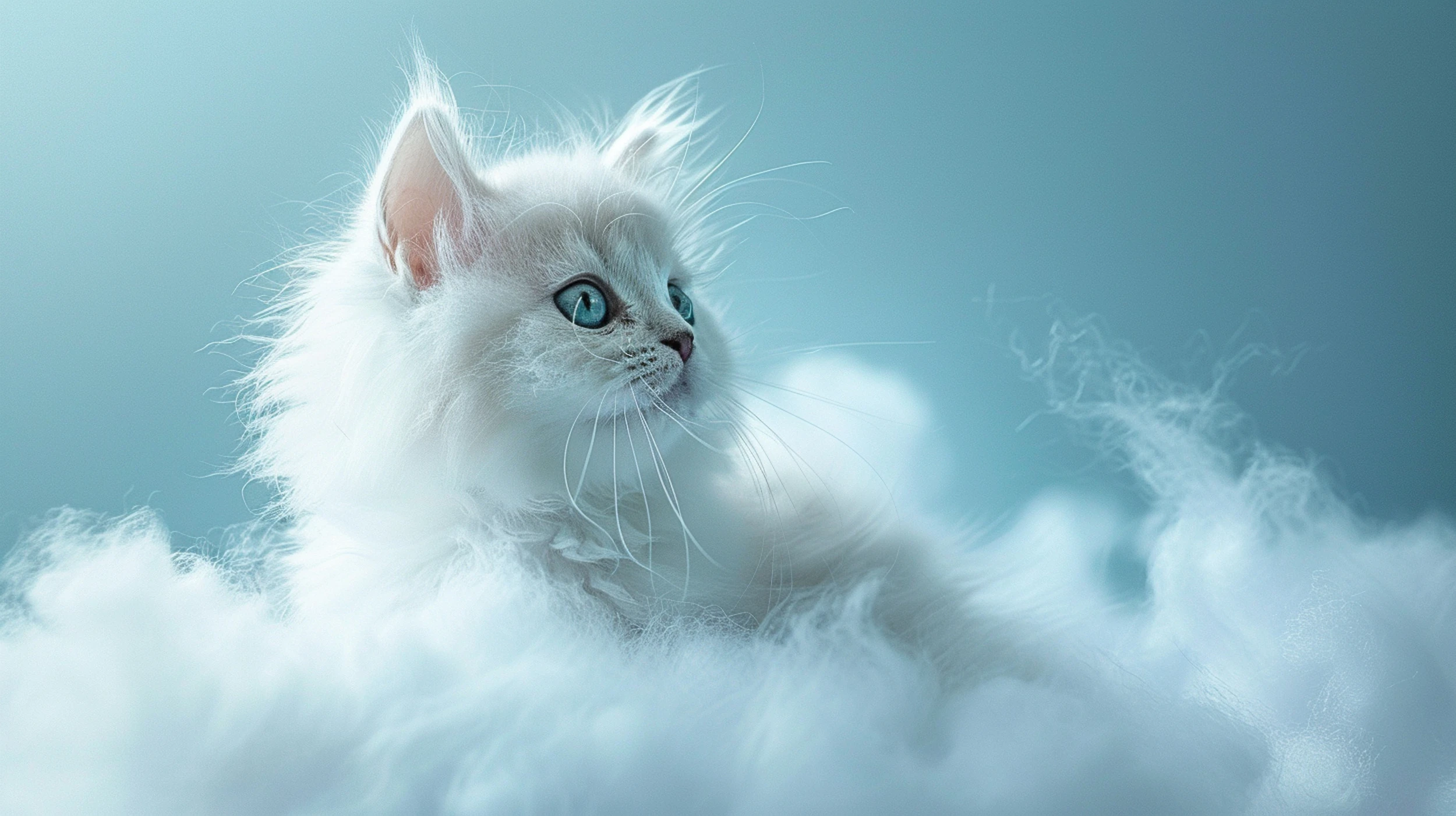 Cette création artistique sublime met en scène un chaton aux yeux bleus d’une beauté saisissante, dont la fourrure d’un blanc pur se fond harmonieusement dans un décor de nuages cotonneux. Le pelage soyeux, finement détaillé, révèle chaque mèche dans une précision photographique qui confère à l’ensemble une dimension presque tactile. Les tons bleus dégradés de l’arrière-plan créent une atmosphère apaisante, oscillant entre bleu ciel et nuances poudrées, tandis que les nuages vaporeux apportent une texture douce et enveloppante à la composition.