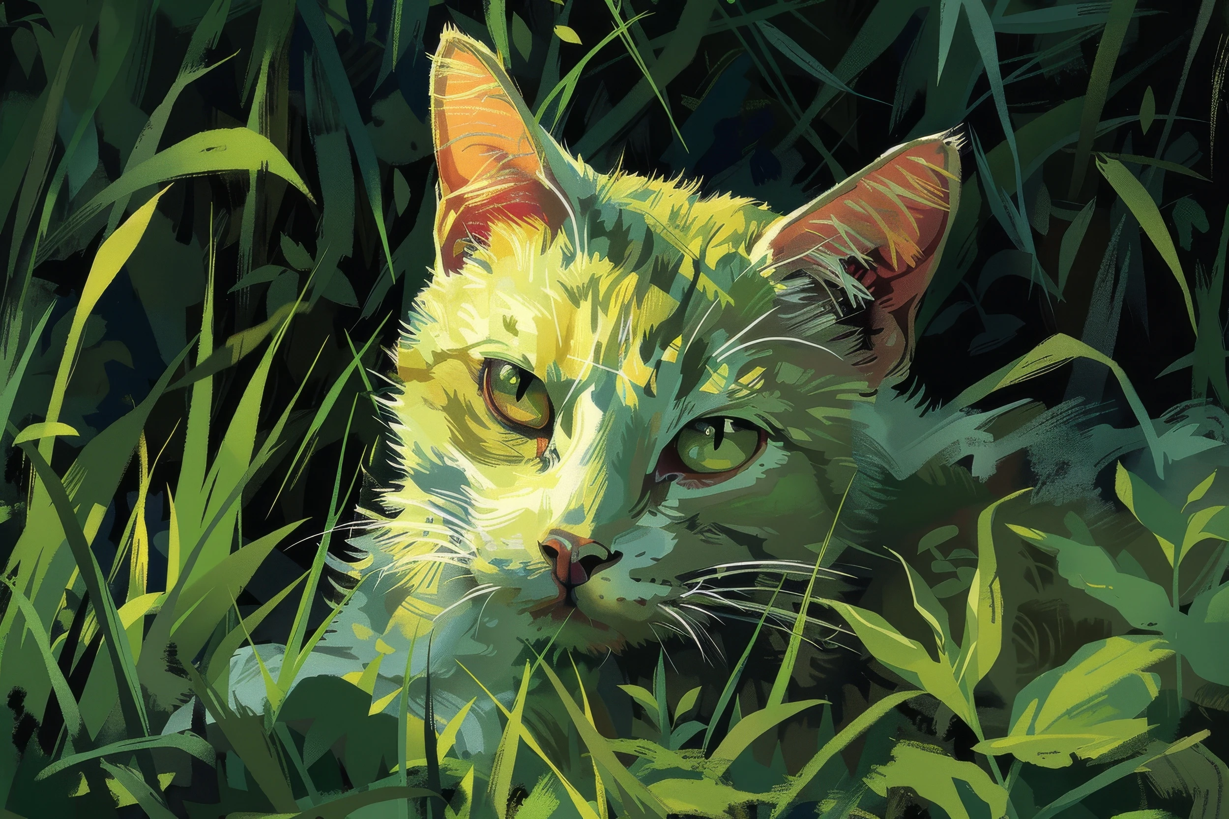 Cette fresque murale artistique révèle le portrait saisissant d’un chat aux yeux verts hypnotiques, niché au milieu d’une abondante végétation tropicale. Le style graphique pictural mêle subtilement techniques de peinture numérique et aquarelle contemporaine, créant des effets de matière et de profondeur remarquables. Les couleurs dominantes oscillent entre des verts émeraude profonds, des jaunes dorés lumineux et des tons orangés chaleureux qui se fondent harmonieusement dans une palette naturelle authentique.