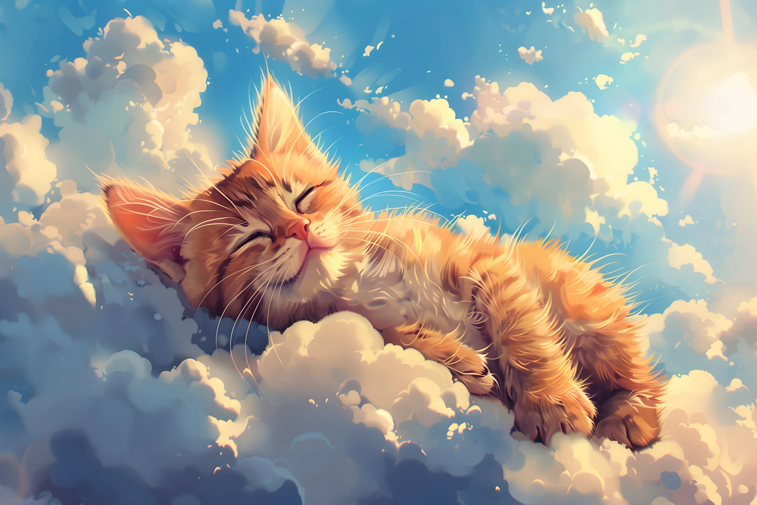 Cette création graphique d’exception révèle un chat tigré orange aux détails saisissants de réalisme, lové avec une grâce infinie sur un lit de nuages blancs cotonneux. Le félin, les yeux mi-clos dans une expression de contentement absolu, semble flotter dans un ciel bleu azur parsemé de formations nuageuses aux reflets dorés. La technique picturale, proche de l’art digital hyperréaliste, sublime chaque poil de sa fourrure rousse et chaque nuance de ses rayures tabby caractéristiques.