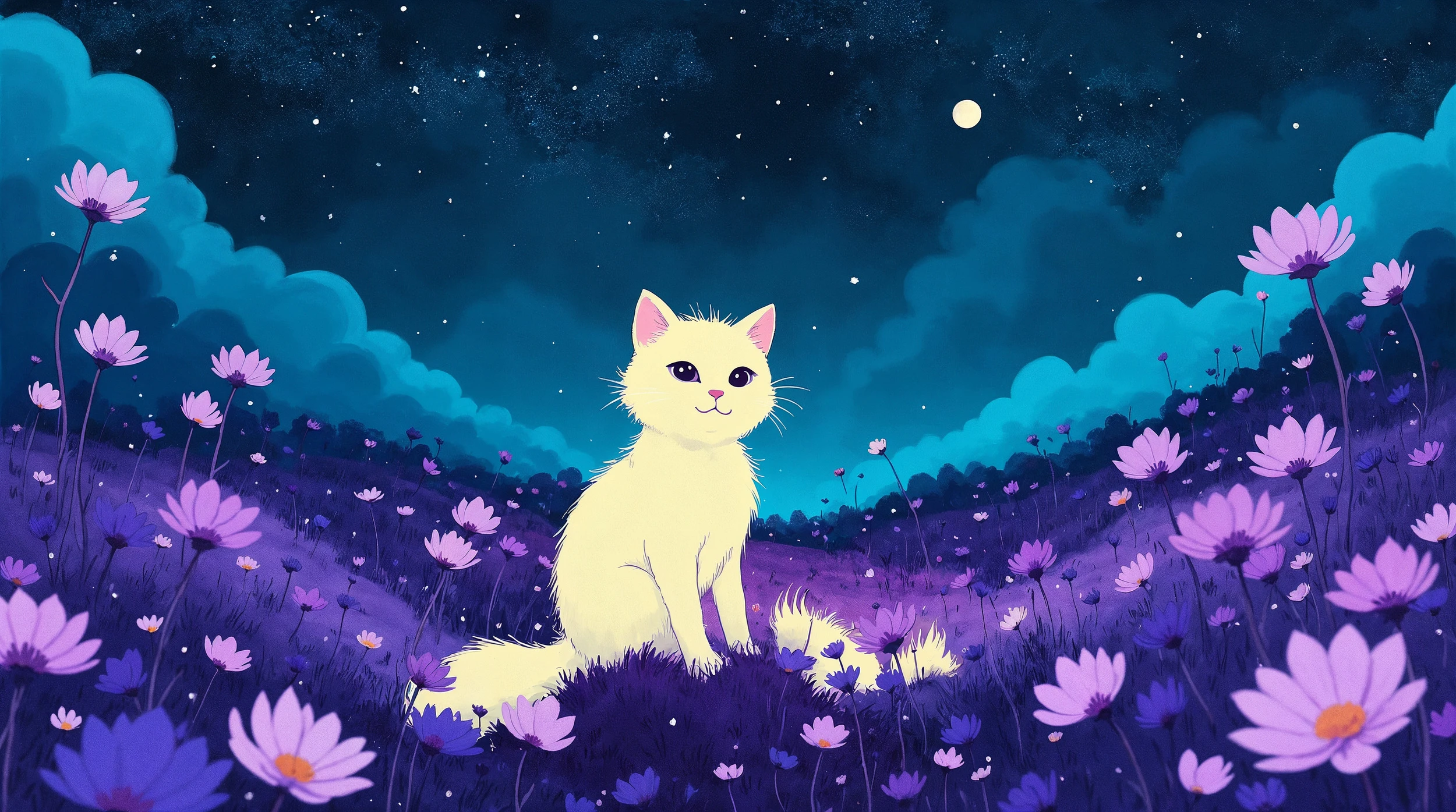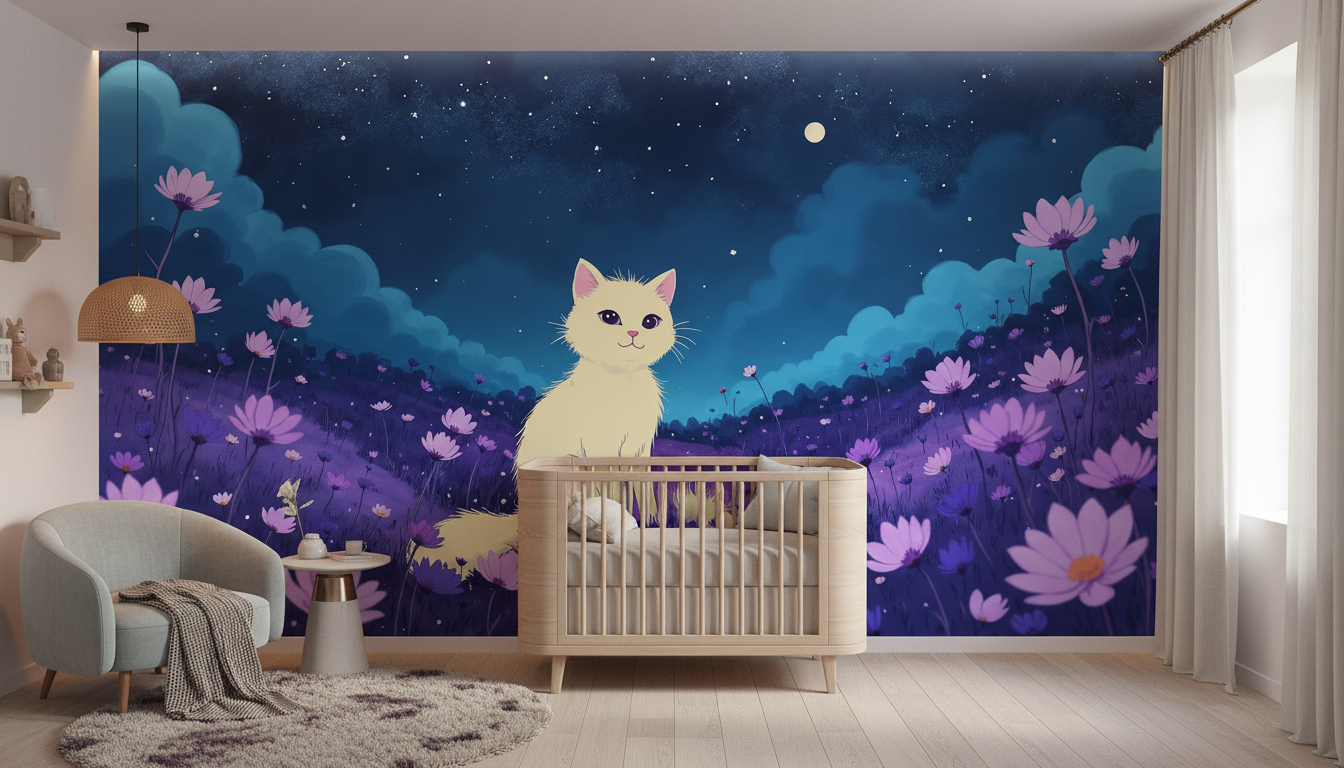Ce papier peint illustré déploie avec une délicatesse remarquable un paysage onirique où se mêlent harmonieusement nature et fantaisie. Au centre de cette composition, un adorable chaton à la fourrure crémeuse trône paisiblement dans un champ de cosmos violets qui ondulent sous la brise nocturne. Les fleurs sauvages aux pétales rose-mauve se dressent à différentes hauteurs, créant un premier plan d’une richesse botanique saisissante. Le style graphique, d’inspiration illustration moderne aux accents de digital painting, offre des détails fins et une texture douce qui confère à l’ensemble une dimension presque tactile.