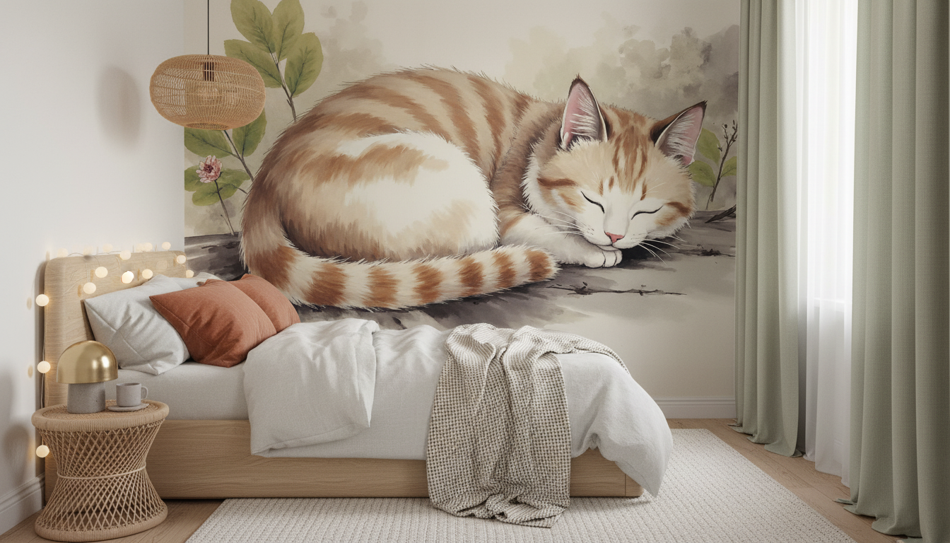 Ce papier peint chat transforme instantanément votre intérieur en un havre de paix où règne une atmosphère cocooning d’une rare authenticité. Il diffuse une sensation de bien-être immédiat, évoquant ces moments précieux de détente où le temps semble suspendu. La présence rassurante de ce félin endormi invite à la relaxation et crée un environnement propice à la méditation et au ressourcement.