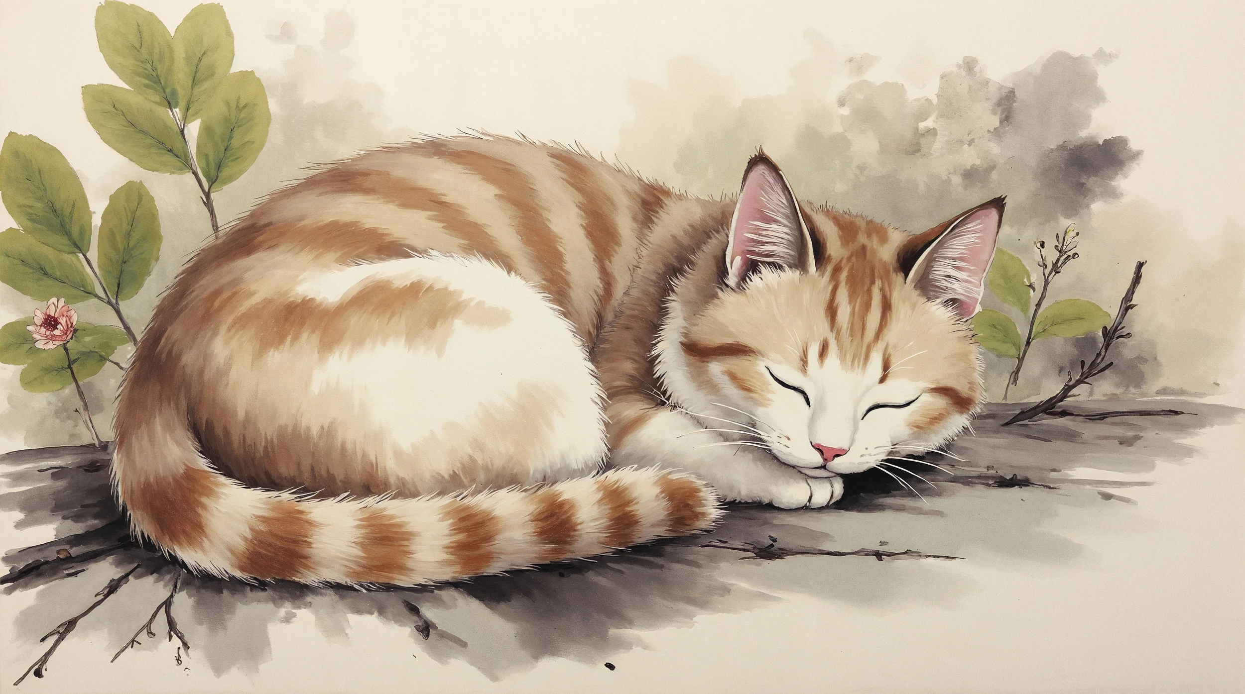 L’arrière-plan se pare d’une végétation délicate composée de branchages aux feuilles vert tendre et de petites fleurs sauvages qui ponctuent la composition avec élégance. Ces éléments botaniques, traités dans un style naturaliste raffiné, créent un écrin végétal qui met en valeur la silhouette endormie du chat. Le sol en bois patiné ajoute une note rustique chaleureuse, tandis que les nuances pastel de l’ensemble confèrent à cette œuvre une atmosphère apaisante et contemplative.
