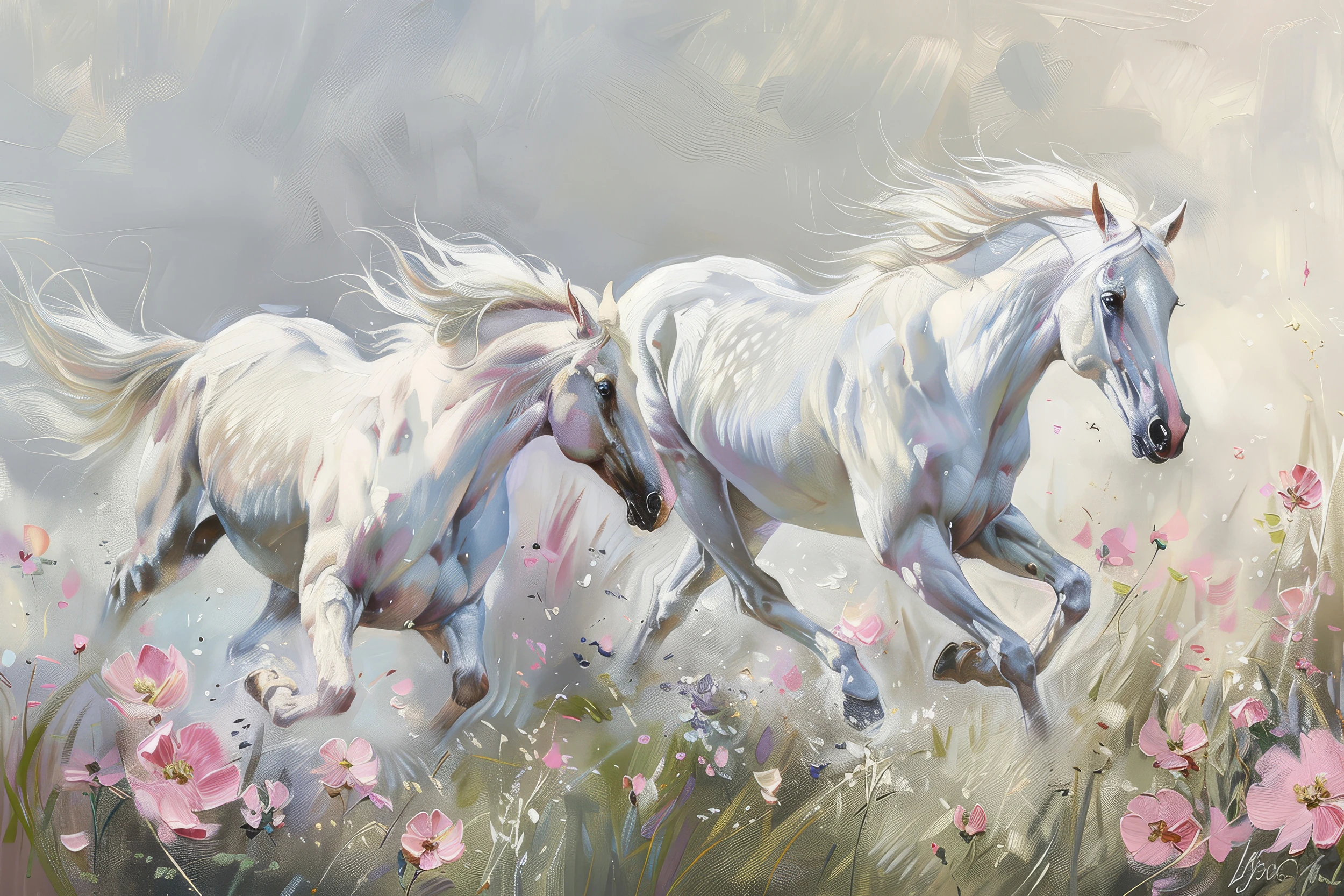 Un souffle de liberté traverse votre intérieur quand deux chevaux blancs s’élancent dans une course éternelle, leurs crinières caressées par un vent invisible, leurs sabots effleurant un tapis de fleurs roses délicates.
