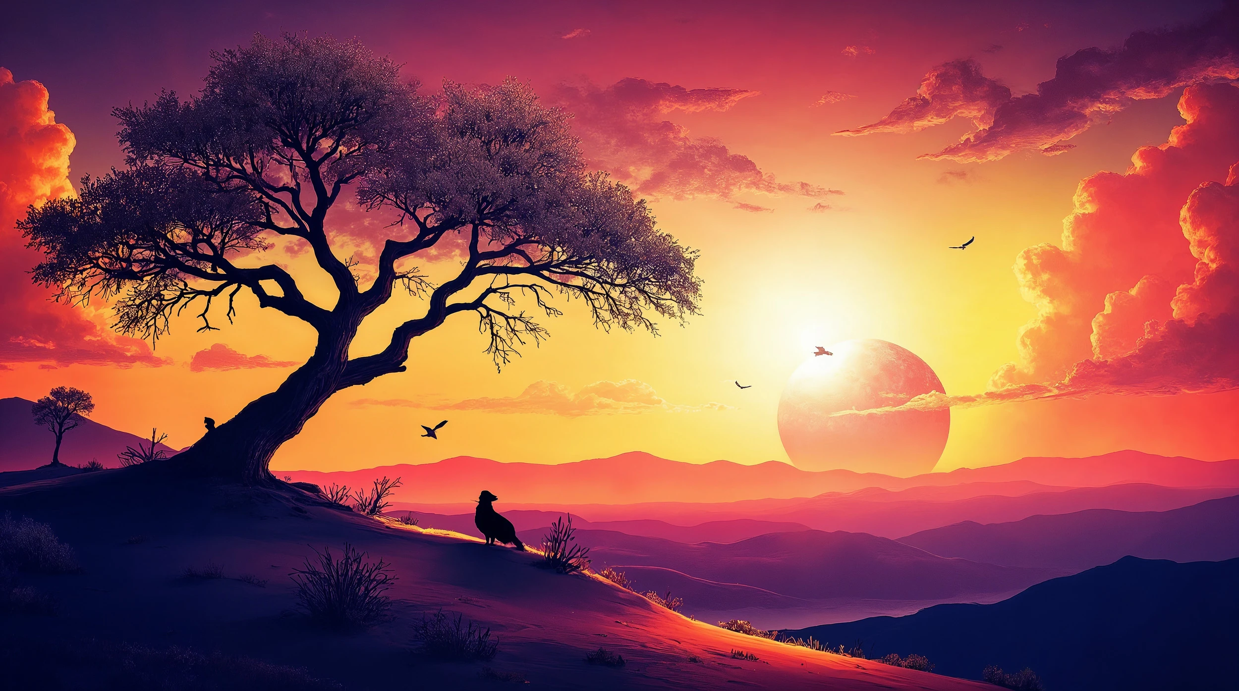 Cette œuvre d’art murale révèle un paysage africain stylisé d’une beauté saisissante. Au premier plan, un majestueux arbre acacia aux branches généreuses se dresse fièrement, ses ramures délicates se détachant contre un ciel embrasé. Une silhouette animale, probablement celle d’un guépard, repose paisiblement sur une colline ondulante, incarnant la sérénité de la faune sauvage. Le regard se perd ensuite vers l’horizon infini, ponctué de montagnes en silhouettes qui s’estompent dans des nuances pourpres et violettes. Des oiseaux en vol libre traversent ce tableau naturel, tandis qu’un second arbre dans le lointain complète cette composition parfaitement équilibrée.