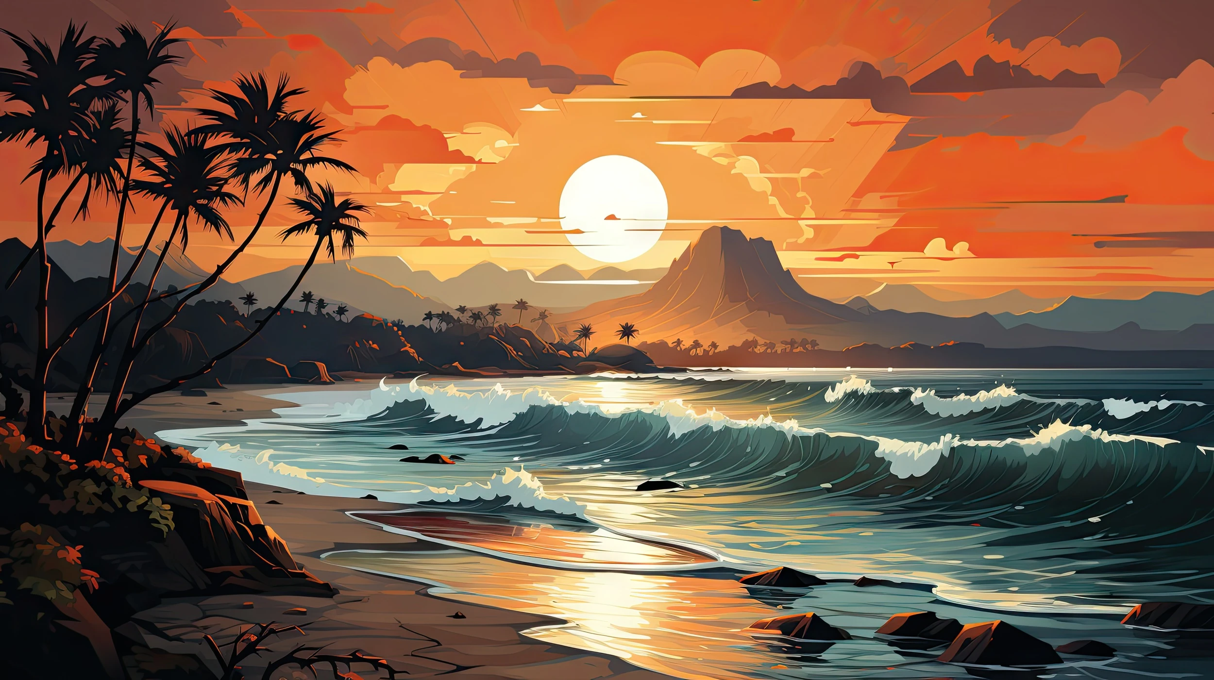 La palette chromatique de ce papier peint coucher de soleil oscille entre les tons orangés flamboyants du ciel crépusculaire et les nuances turquoise de l’océan. Les teintes dorées se reflètent sur les flots, créant un jeu de lumière d’une poésie absolue. Le style graphique, aux allures de peinture numérique, conjugue réalisme et stylisation pour un rendu à la fois moderne et intemporel.