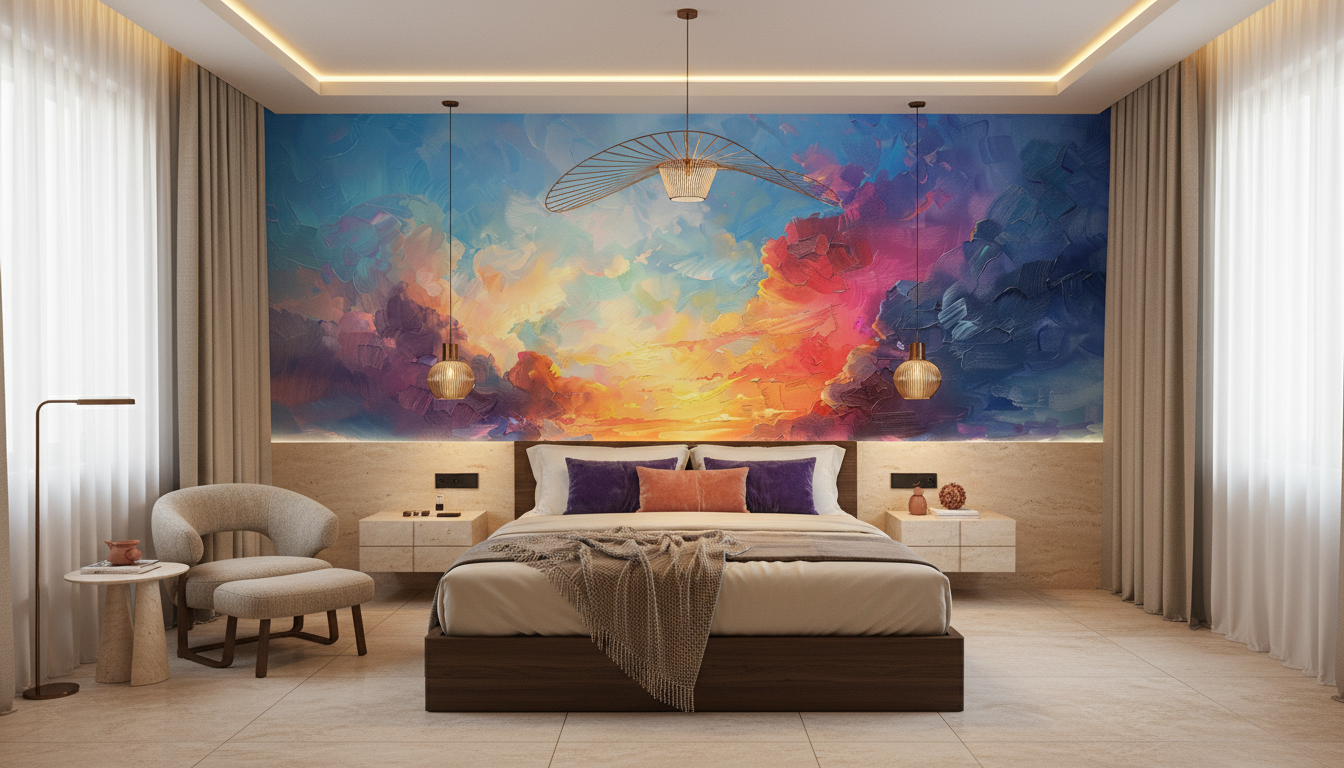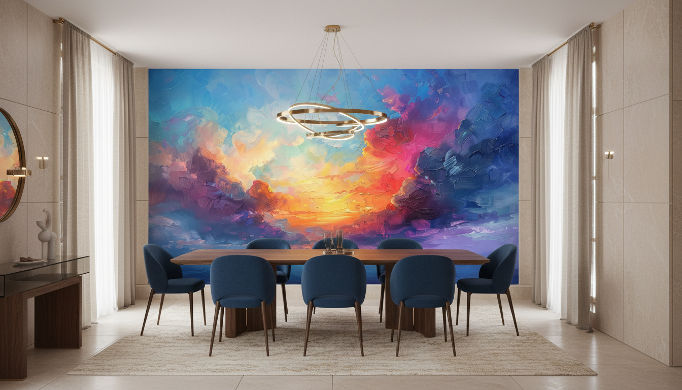 Idéal pour habiller le mur principal du salon, ce papier peint devient une véritable œuvre d’art murale qui dialogue magnifiquement avec un mobilier aux lignes épurées. Dans une chambre parentale, il crée une ambiance romantique et enveloppante, particulièrement mis en valeur par des textiles en lin naturel et des accessoires en laiton brossé. Un bureau créatif ou un atelier d’artiste trouvera dans cette décoration murale une source d’inspiration inépuisable. Associez-le à des tons neutres – beige lin, blanc cassé, gris perle – pour laisser s’exprimer pleinement sa palette colorée, ou osez l’alliance avec des matières brutes comme le bois vieilli et le métal patiné pour un style industriel poétique.