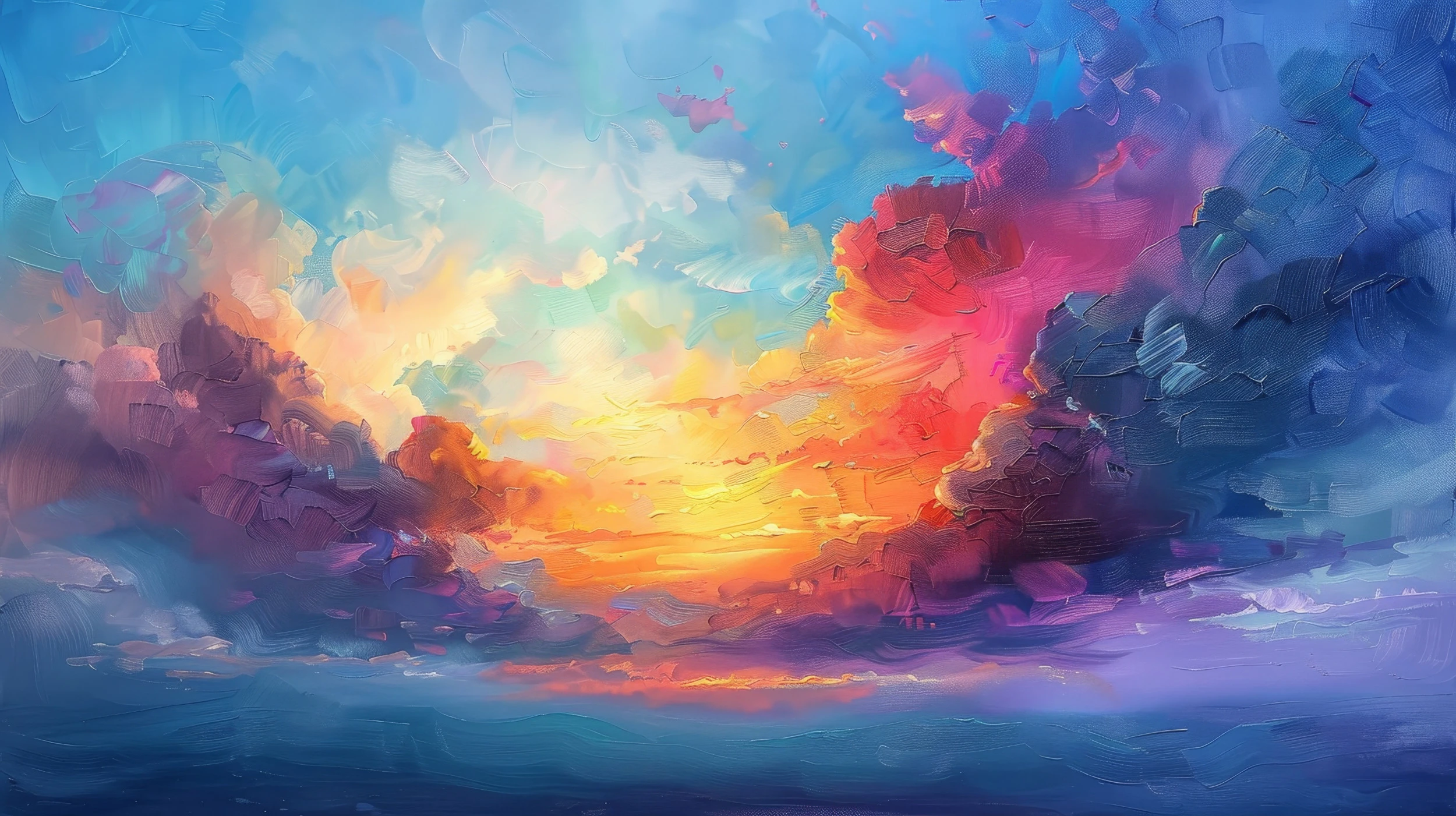 Ce papier peint peinture abstraite capture la magnificence d’un ciel dramatique dans toute sa splendeur expressionniste. Les nuages volumineux se déploient avec une texture picturale saisissante, évoquant la technique de l’impasto et les coups de pinceau généreux des maîtres de la peinture. Au cœur de cette composition, un soleil couchant flamboyant irradie de teintes dorées et orangées, créant un contraste saisissant avec les bleus profonds qui dominent la partie supérieure de l’œuvre. Les tons chauds – rouge vermillon, orange cuivré, jaune lumineux – se mêlent harmonieusement aux nuances froides de bleu cobalt, turquoise et violet, créant une palette chromatique d’une richesse exceptionnelle.