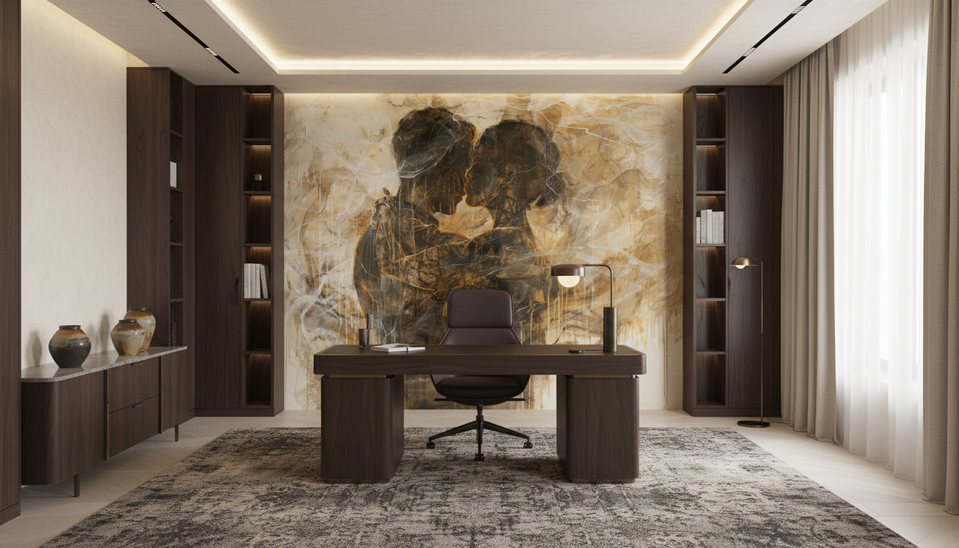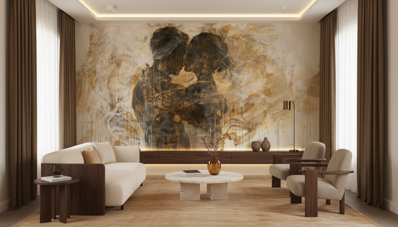 Cette création murale contemporaine insuffle instantanément une atmosphère de romantisme sophistiqué dans votre intérieur. L’émotion qui s’en dégage est à la fois apaisante et profondément touchante, créant un cocon d’intimité où règne une sérénité contemplative. Ce papier peint moderne transforme l’espace en sanctuaire artistique, où chaque regard révèle de nouveaux détails, de nouvelles nuances dans ce ballet de formes entrelacées.