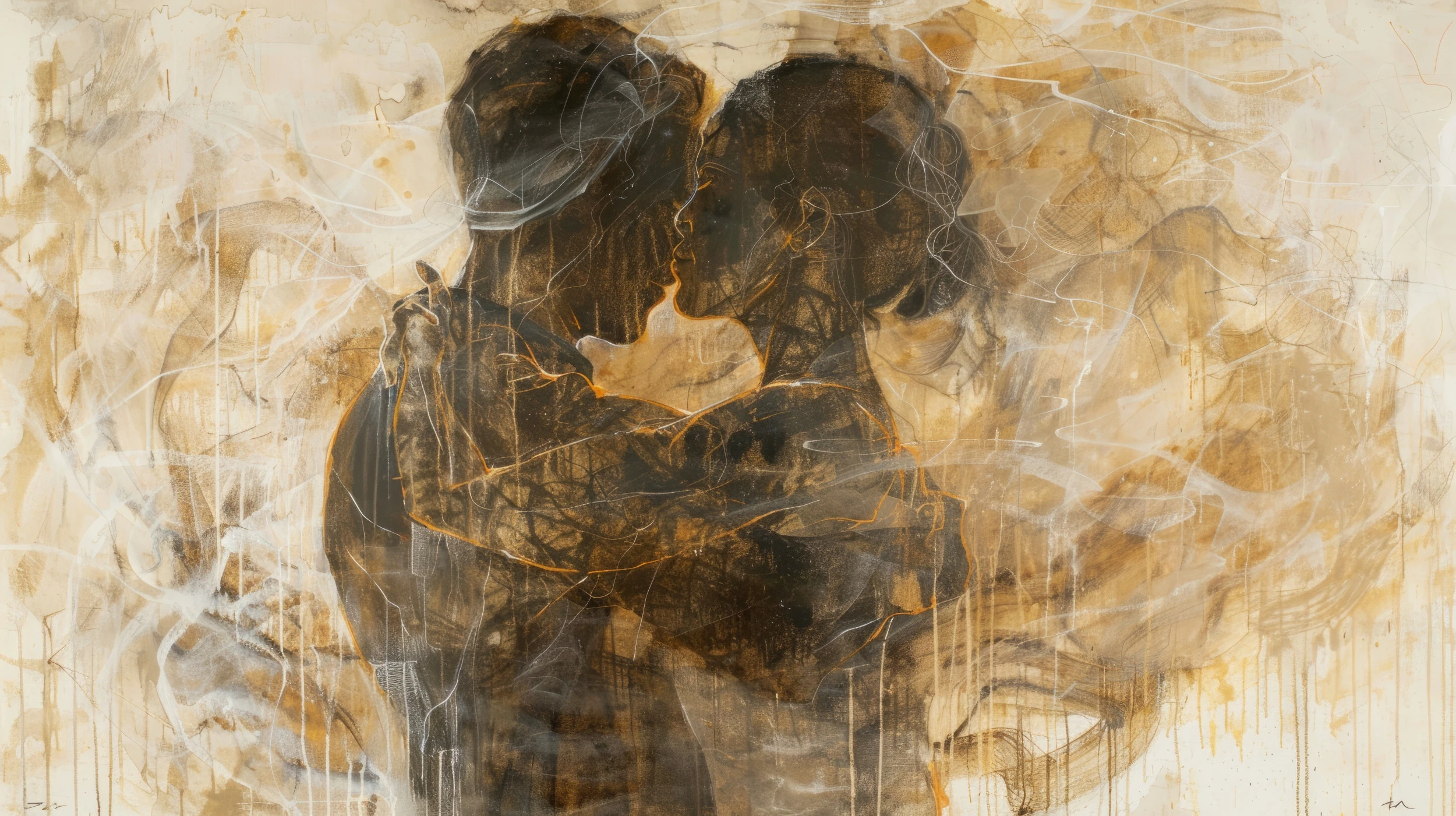 Dans un souffle tendre et nacré, deux silhouettes s’enlacent dans une danse éternelle, où l’amour se révèle à travers les nuances dorées d’un rêve suspendu dans le temps.