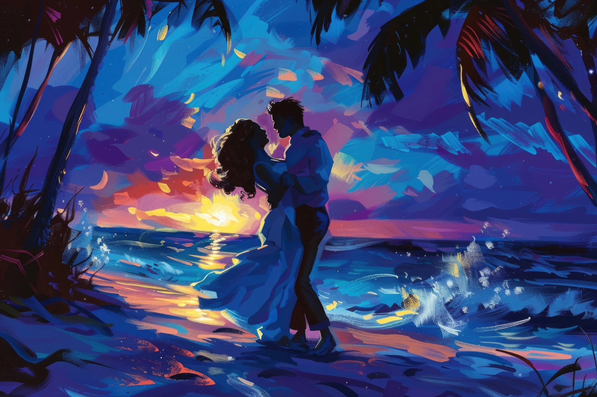 Sous un ciel nocturne vibrant de mille couleurs, deux silhouettes s’enlacent tendrement sur une plage tropicale baignée de lumière stellaire, créant une scène d’une beauté à couper le souffle qui transformera votre intérieur en sanctuaire romantique.
