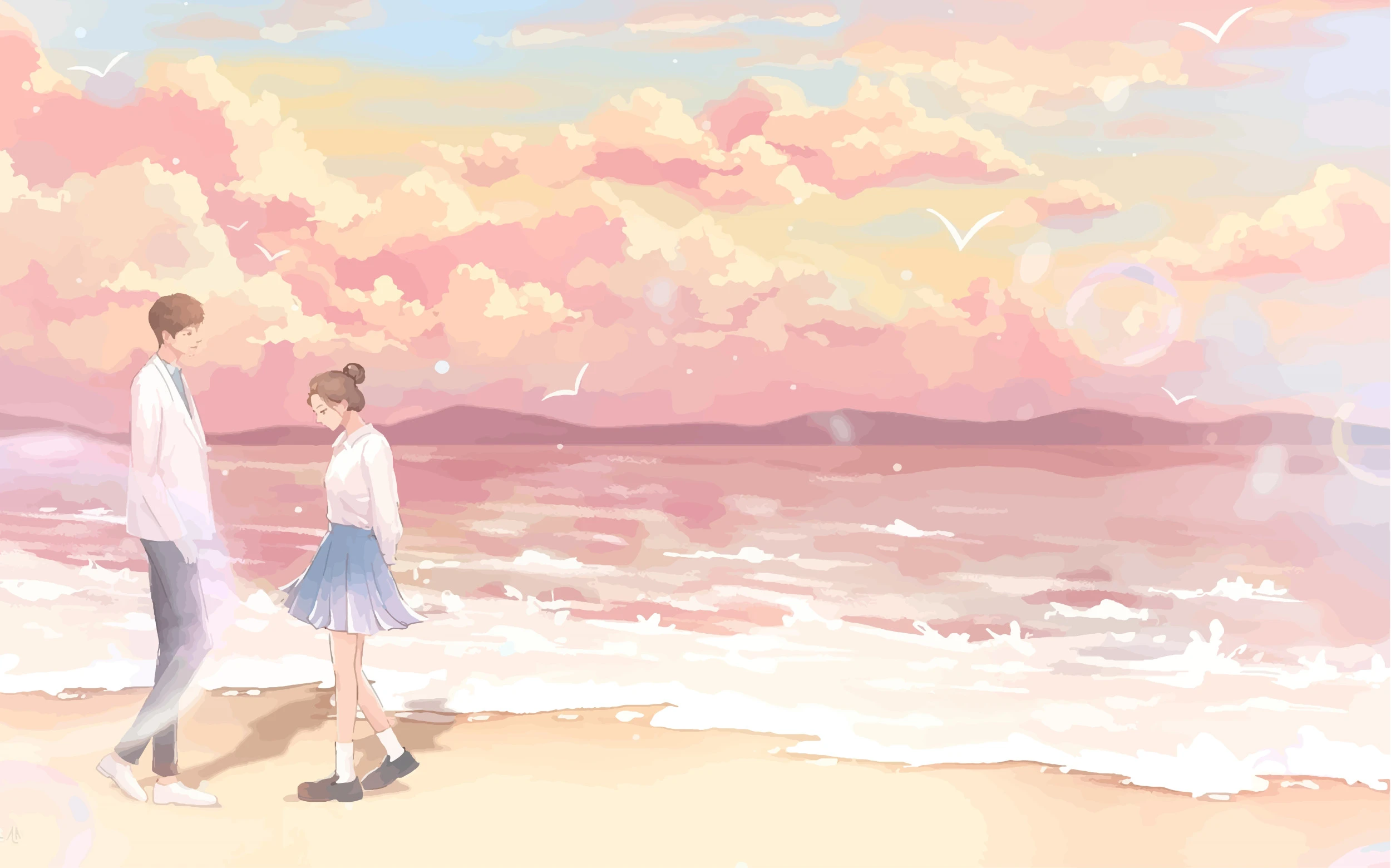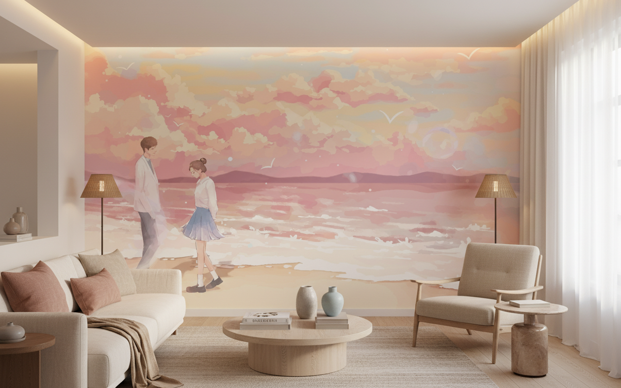 Ce papier peint romantique capture avec une délicatesse infinie l’instant magique d’une promenade à deux le long du rivage. Les tons roses poudrés, corail et dorés se mêlent harmonieusement dans un ciel nuageux parsemé d’oiseaux en vol, créant une atmosphère d’une poésie saisissante. Le couple, représenté dans un style illustré contemporain, évoque la tendresse d’un moment suspendu où la femme en jupe plissée bleue et l’homme en chemise blanche foulent le sable doré. Les vagues stylisées viennent caresser la rive tandis que les nuances pastel se reflètent sur l’eau, créant un jeu de lumière d’une beauté éthérée.