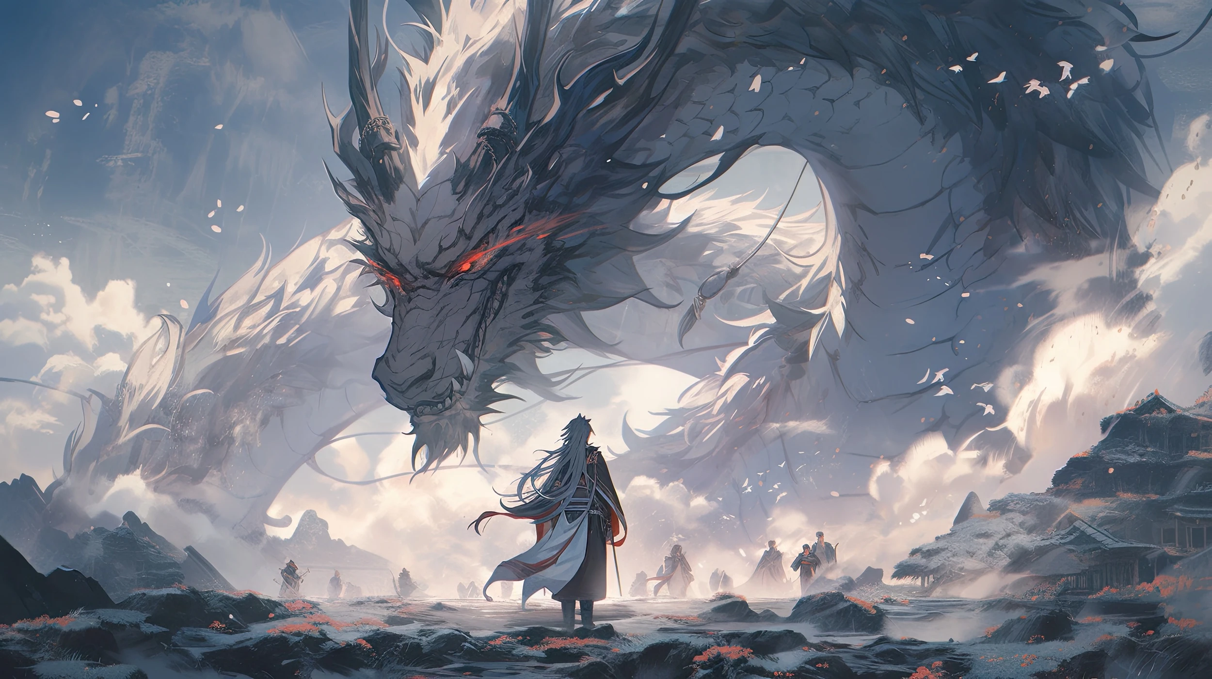 La palette chromatique privilégie les tons bleus profonds et les nuances grises nacrées, sublimées par des touches de rouge incandescent qui illuminent le regard perçant du dragon. Les nuages voluptueux aux reflets dorés créent un contraste saisissant avec la roche volcanique du paysage désolé, parsemé de formations cristallines rougeoyantes.