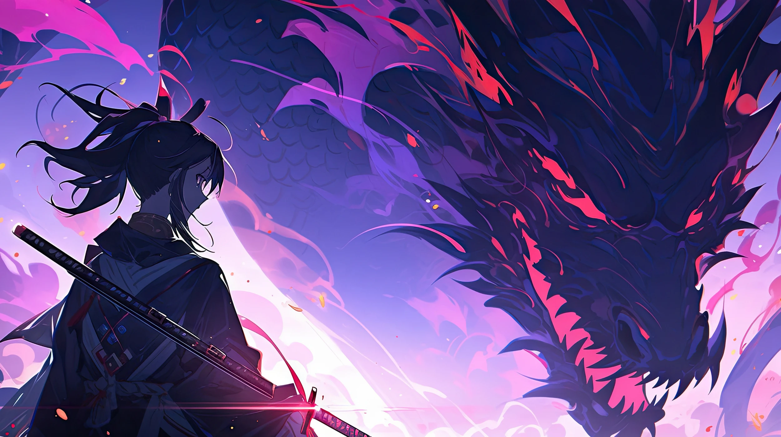 Ce papier peint manga d’exception capture l’intensité dramatique d’un affrontement légendaire entre un guerrier aux cheveux de jais et une créature draconique aux écailles sombres. Le style graphique anime révèle une maîtrise artistique remarquable, où chaque trait vectoriel semble animé d’une énergie pure. La palette chromatique oscille entre des violets profonds, des roses magenta et des bleus nuit ponctués d’éclats corail, créant une symphonie visuelle d’une rare intensité. Les effets de lumière et les volutes d’énergie qui traversent la composition apportent une dimension cinématographique saisissante.