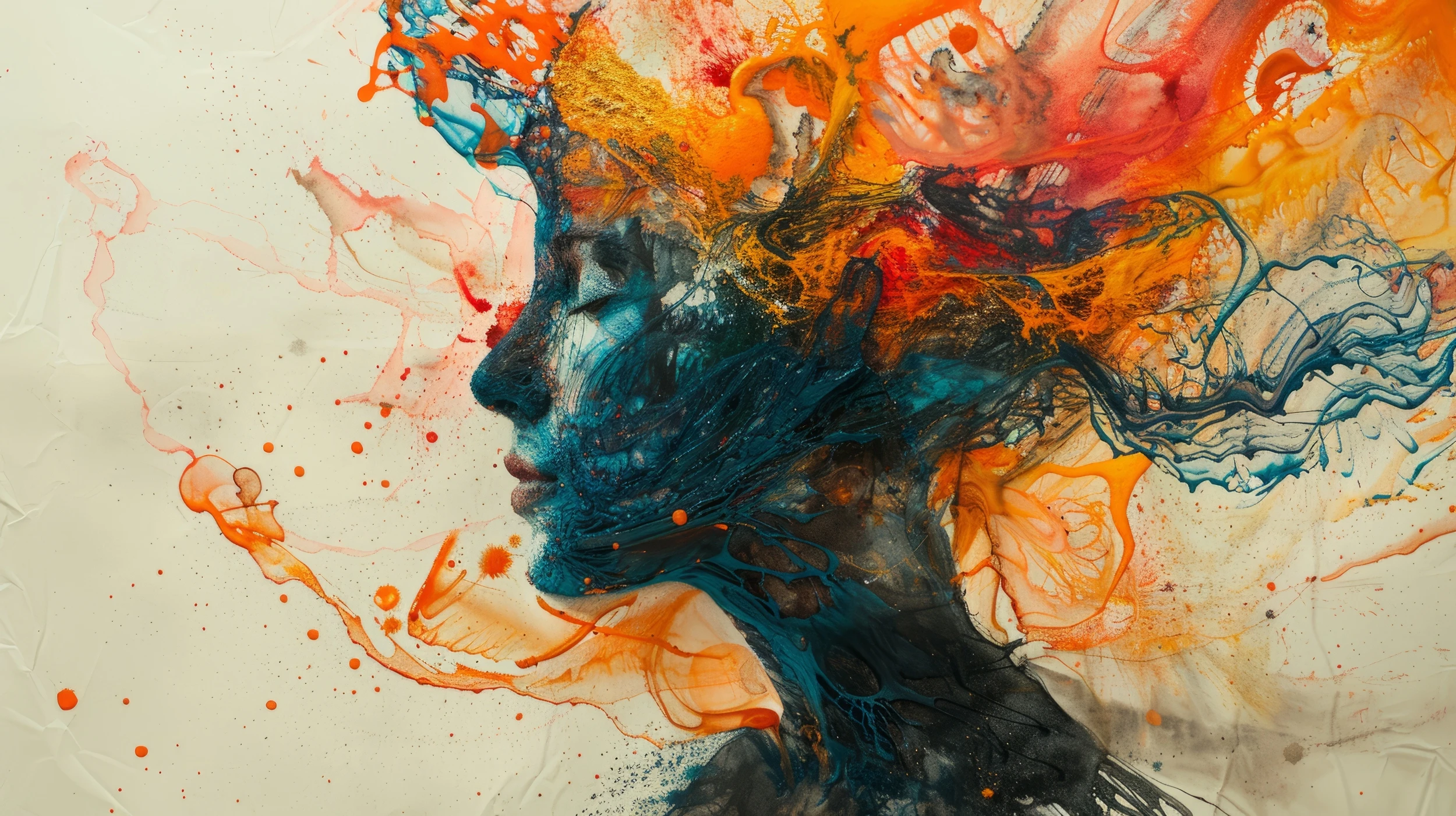 Ce papier peint artistique contemporain révèle un portrait féminin saisissant, sublimé par une explosion de couleurs vives et de matières fluides. Le visage de profil, aux traits délicats et mélancoliques, se fond harmonieusement dans un tourbillon de peinture abstraite aux nuances orange brûlé, turquoise profond et rouge vermillon. Les cheveux se transforment en vagues colorées, créant un mouvement hypnotique qui semble défier les lois de la gravité.
