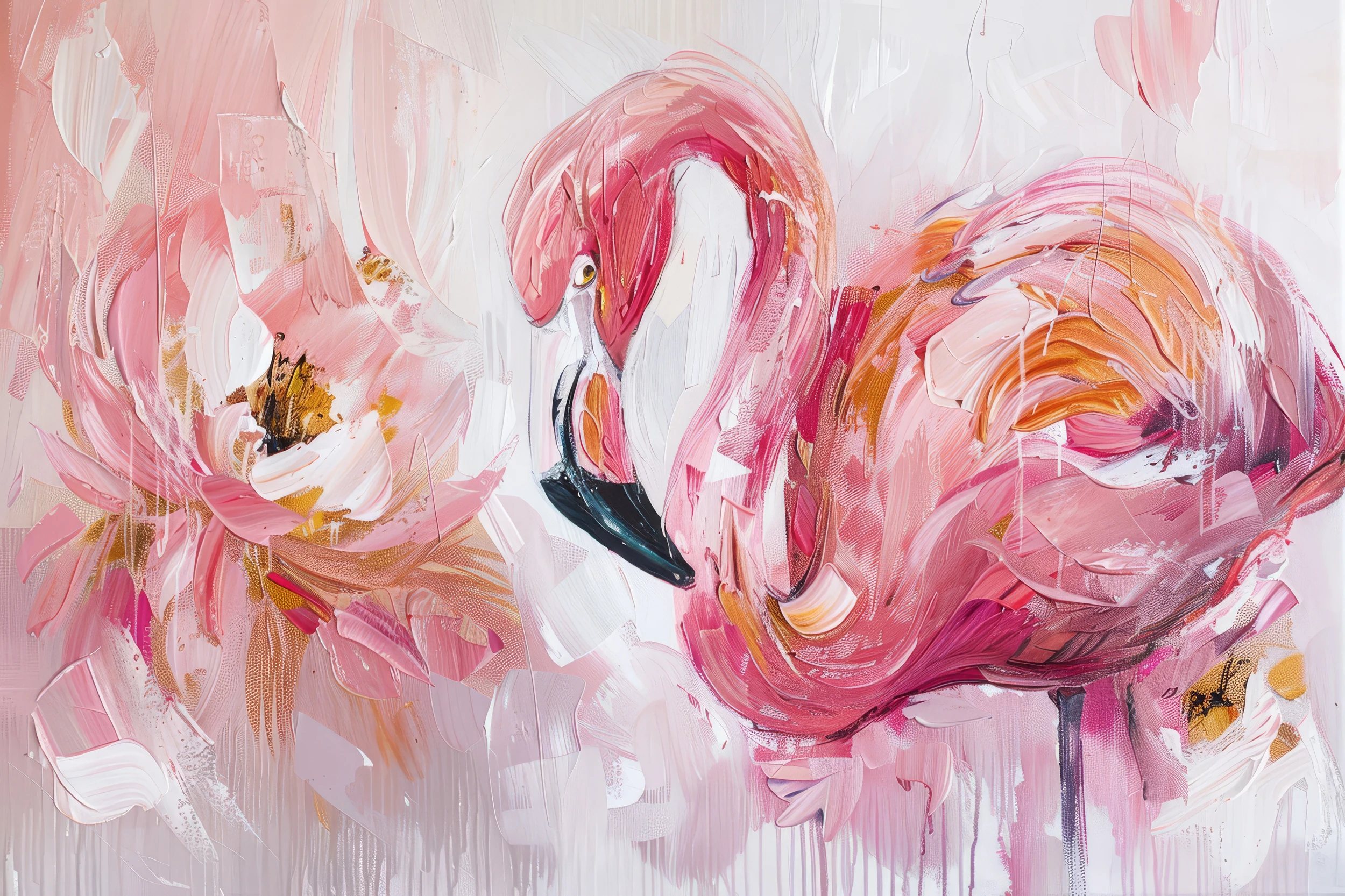 Cette œuvre murale dévoile un flamant rose stylisé aux courbes voluptueuses, peint dans un style abstrait contemporain d’une beauté envoûtante. Les coups de pinceau expressifs dessinent les plumes de l’oiseau dans une palette raffinée de roses poudrés, roses vifs et corail, ponctuée de touches d’orange chaleureux et de doré scintillant. Le bec noir profond de l’animal contraste élégamment avec la douceur des teintes rosées, tandis qu’un fond blanc nacré sublime cette composition picturale exceptionnelle.