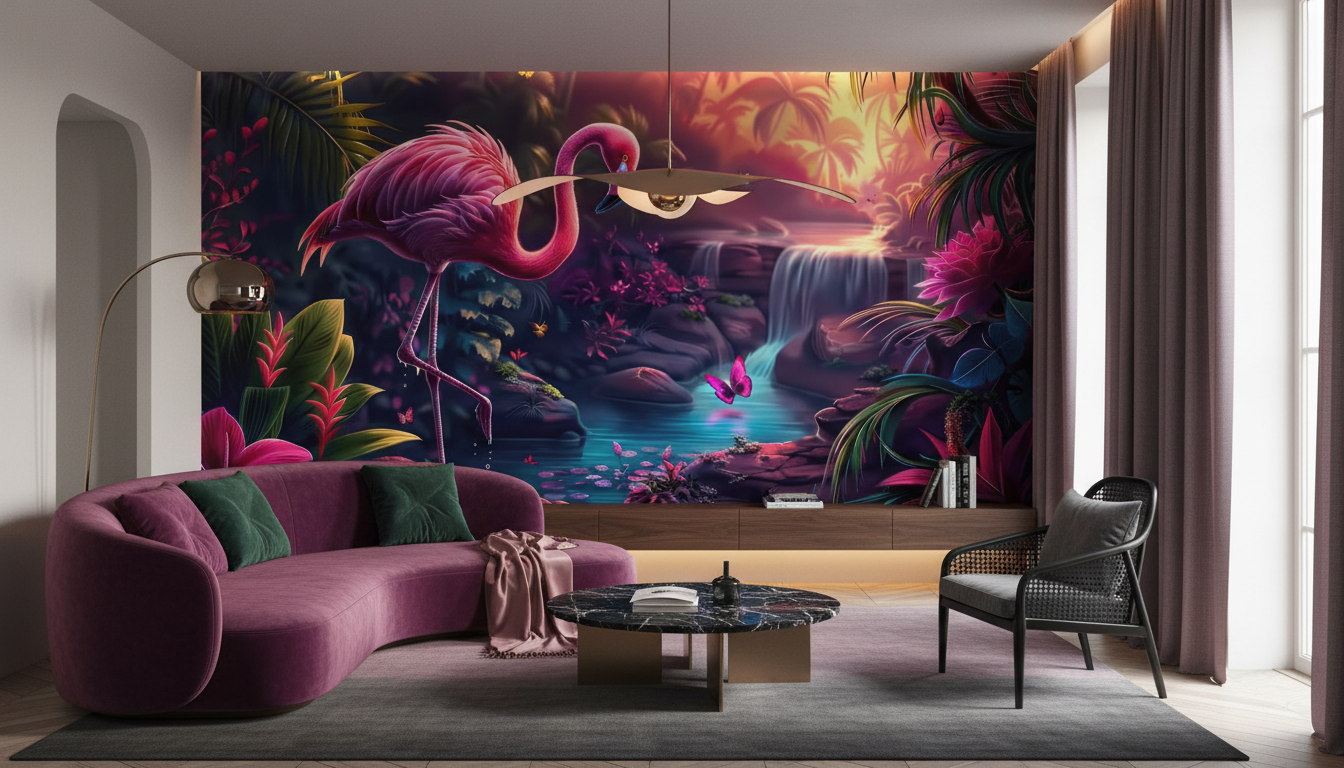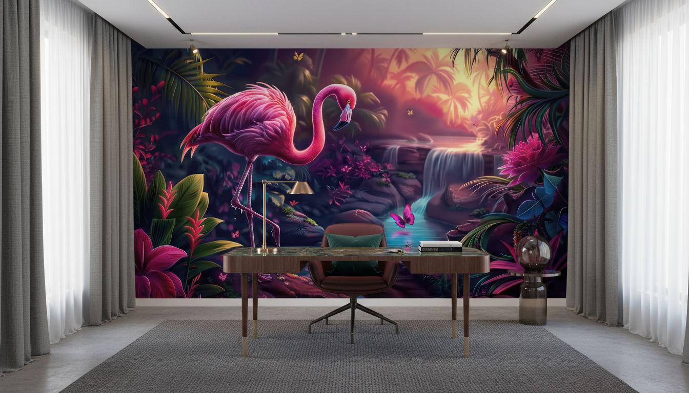 Ce papier peint tropical fantastique révèle un univers enchanté d’une richesse visuelle saisissante. Au cœur de cette composition artistique, un majestueux flamant rose aux plumes chatoyantes se dresse élégamment près d’un bassin cristallin, entouré d’une végétation luxuriante aux couleurs saturées. Les palmiers exotiques déploient leurs frondes dans un dégradé de verts émeraude et de roses fuchsia, créant un contraste saisissant avec les fleurs tropicales aux pétales écarlates et magenta.