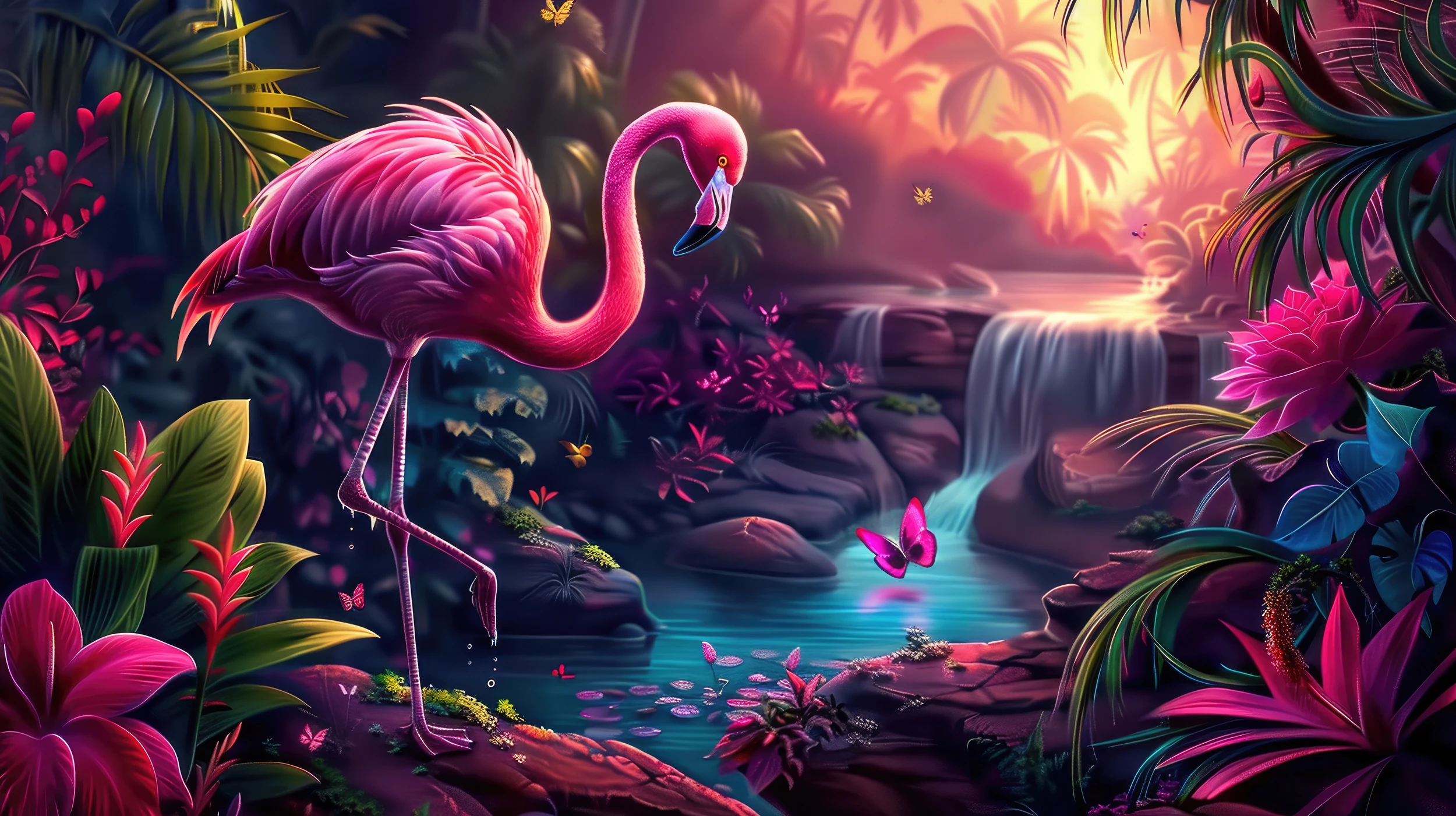 Laissez-vous transporter dans un paradis tropical où la magie opère au coucher du soleil, quand les derniers rayons dorés caressent une oasis secrète peuplée de créatures féeriques.