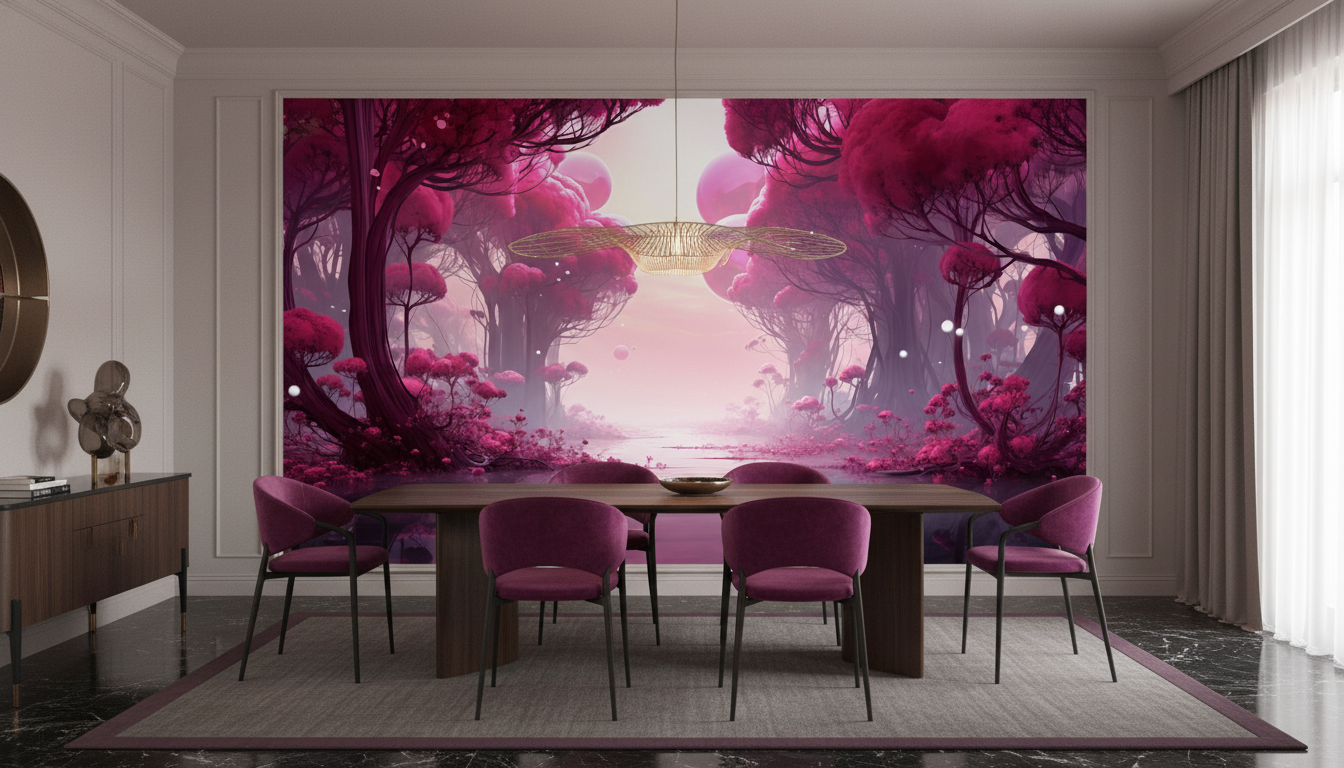 Plongez dans un univers onirique où la magie des aurores boréales baigne une forêt enchantée de reflets roses et violets, créant une atmosphère d’une beauté surnaturelle qui transformera instantanément votre intérieur en sanctuaire poétique.