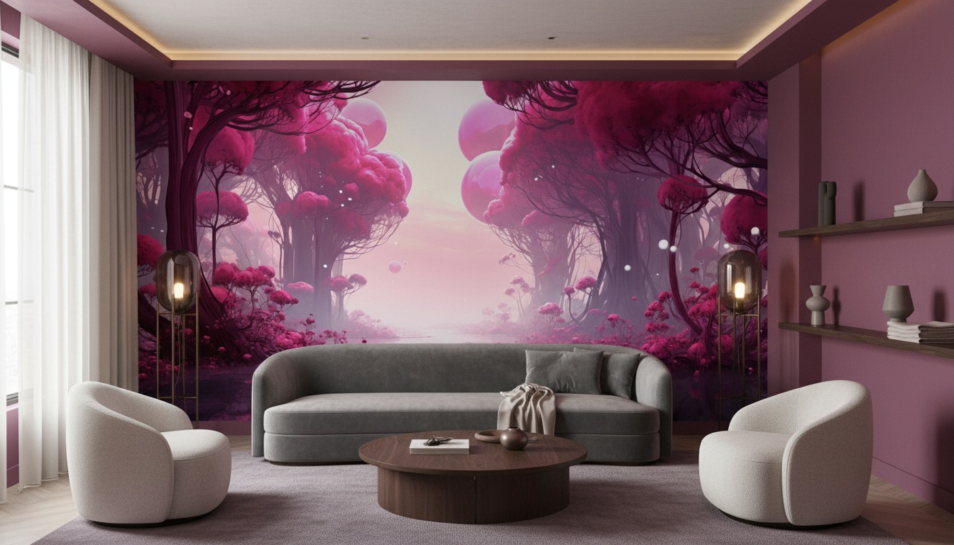 Dans une chambre parentale, ce papier peint romantique créera un cocon d’intimité parfait, sublimé par l’association avec du linge de lit en lin blanc et des meubles en bois clair. Pour une chambre d’enfant ou d’adolescent, il apportera une touche manga moderne et poétique, particulièrement mis en valeur par des luminaires en forme de nuages et des coussins roses poudrés. Dans un salon contemporain, positionnez-le sur le mur principal et harmonisez-le avec un canapé en velours gris perle, des accessoires en laiton rosé et quelques plantes aux feuillages pourpres pour créer une continuité chromatique raffinée.
