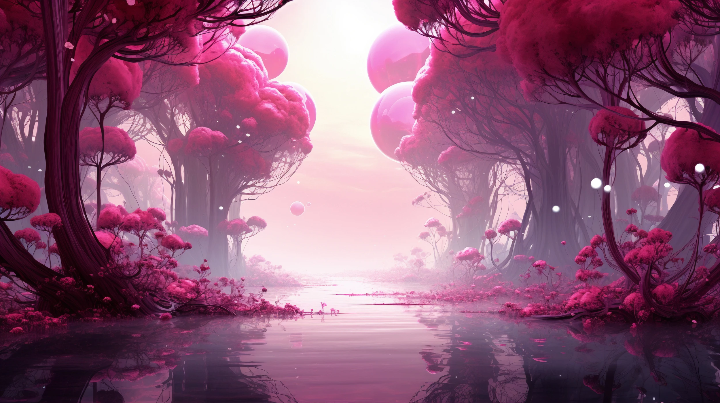 Ce papier peint fantastique révèle un paysage féerique d’une délicatesse extraordinaire, où s’épanouit une forêt rose aux allures de conte de fées. Les arbres majestueux déploient leurs feuillages cotonneux dans des nuances de rose fuchsia et de magenta profond, créant un contraste saisissant avec les troncs sombres qui s’élancent vers un ciel opalescent. Au premier plan, un cours d’eau miroitant reflète cette symphonie chromatique, bordé de buissons fleuris aux teintes éclatantes qui ponctuent harmonieusement la composition.
