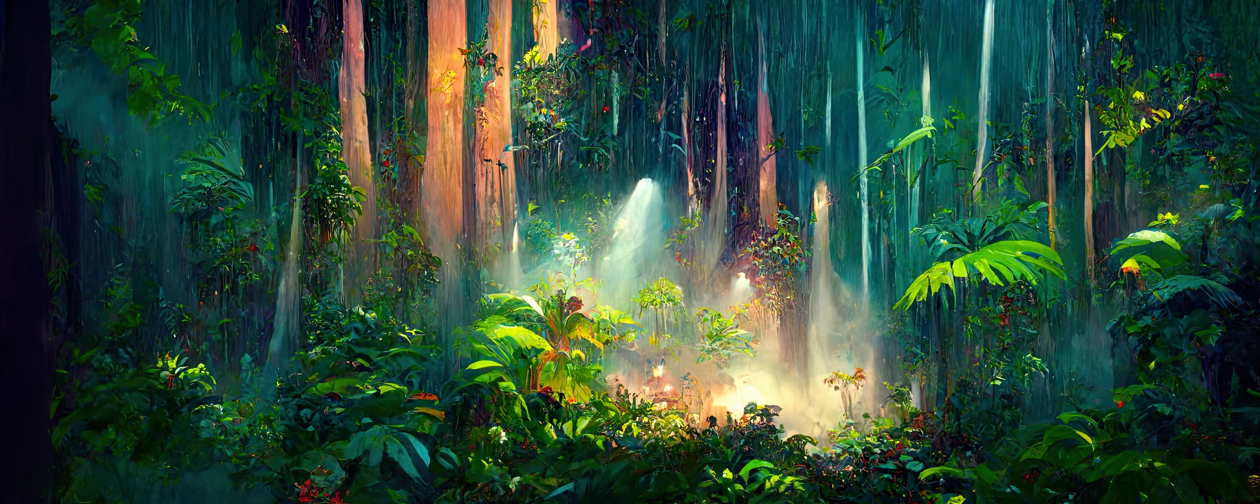 Laissez-vous transporter dans un sanctuaire mystique où la lumière dorée perce à travers la canopée luxuriante d’une forêt primordiale, révélant la beauté sauvage d’un monde préservé.