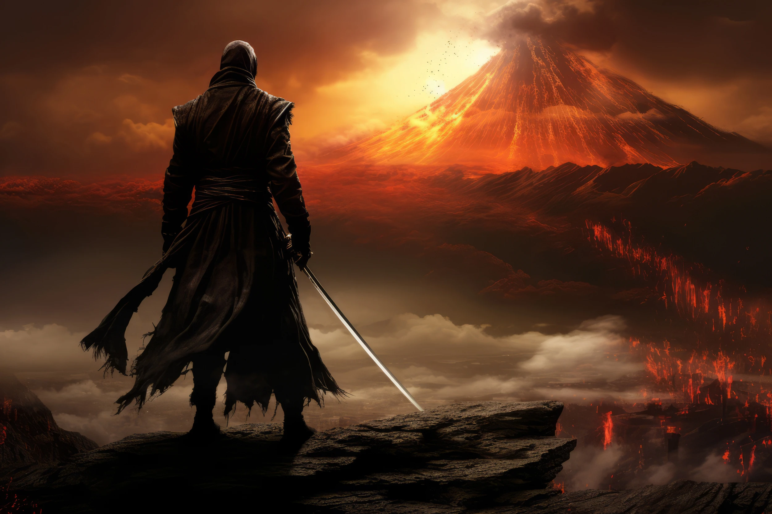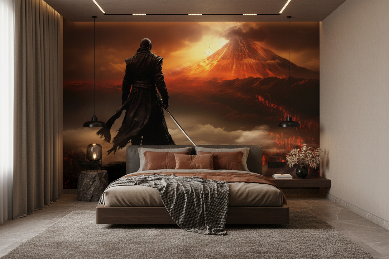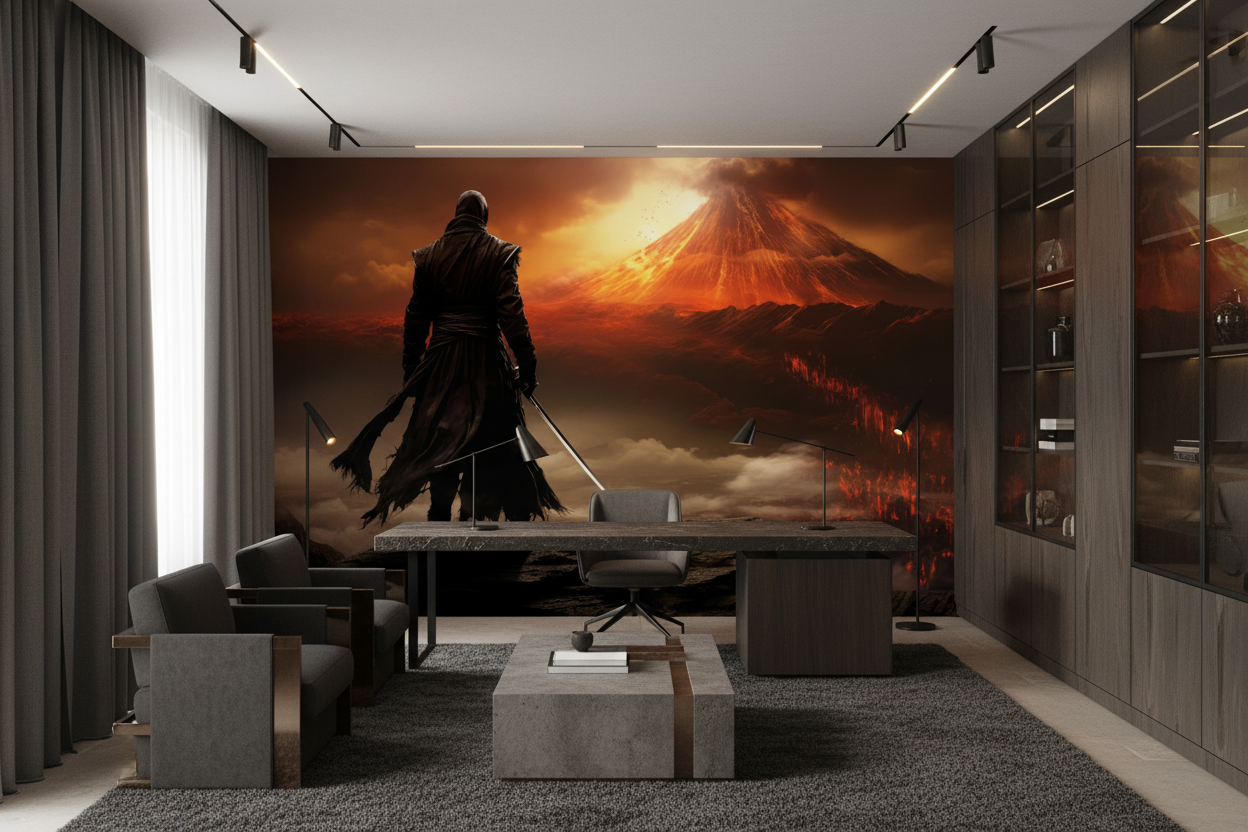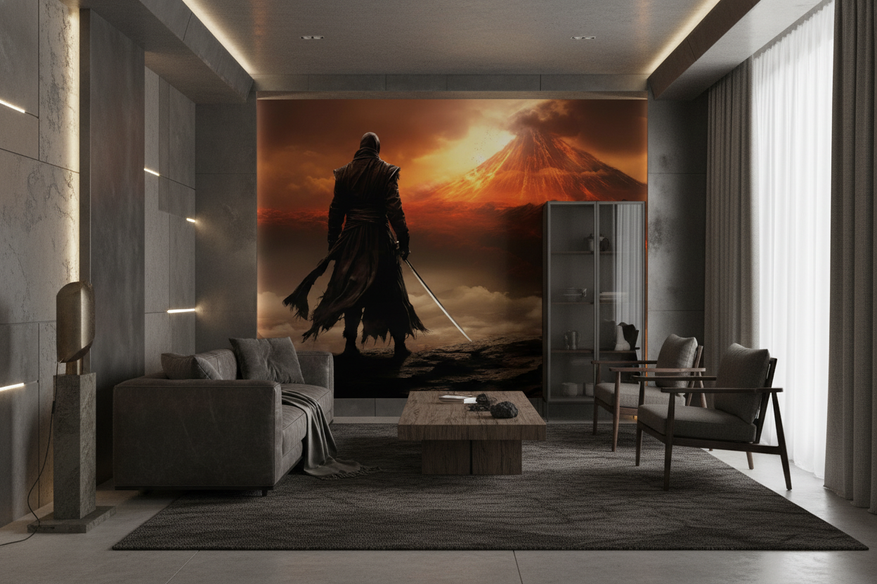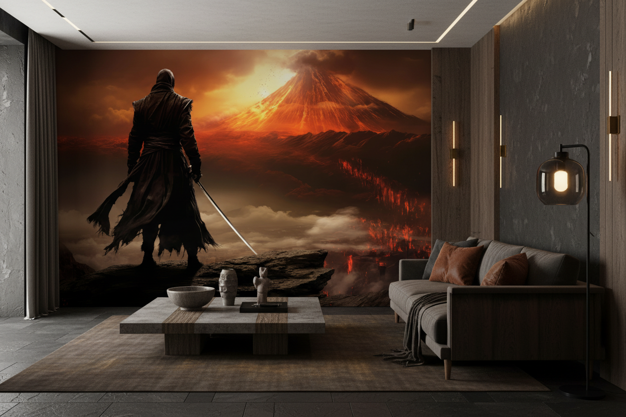 Ce papier peint épique révèle un guerrier solitaire contemplant un paysage volcanique spectaculaire, où les flammes orange et rouge dansent dans un ciel tumultueux. La composition magistrale présente une scène fantasy dramatique d’une intensité saisissante : un personnage encapuchonné, drapé d’un manteau aux pans déchirés par le vent, se tient sur un promontoire rocheux, une épée étincelante à la main. Au second plan, un volcan en éruption projette ses coulées de lave incandescente vers un horizon embrasé, créant un contraste saisissant entre les tons ocre profonds, orange flamboyant et rouge ardent.