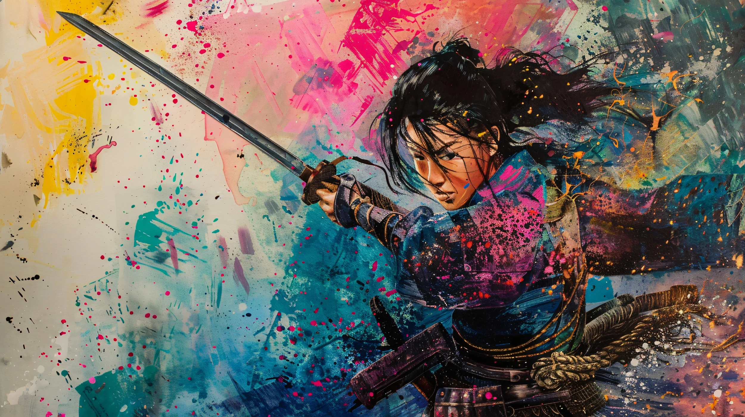 Dans un tourbillon de couleurs et de mouvement, une samouraï surgit des brumes de l’art contemporain, sa lame tranchant l’air dans une explosion de pigments vibrants qui transforment votre mur en théâtre épique.
