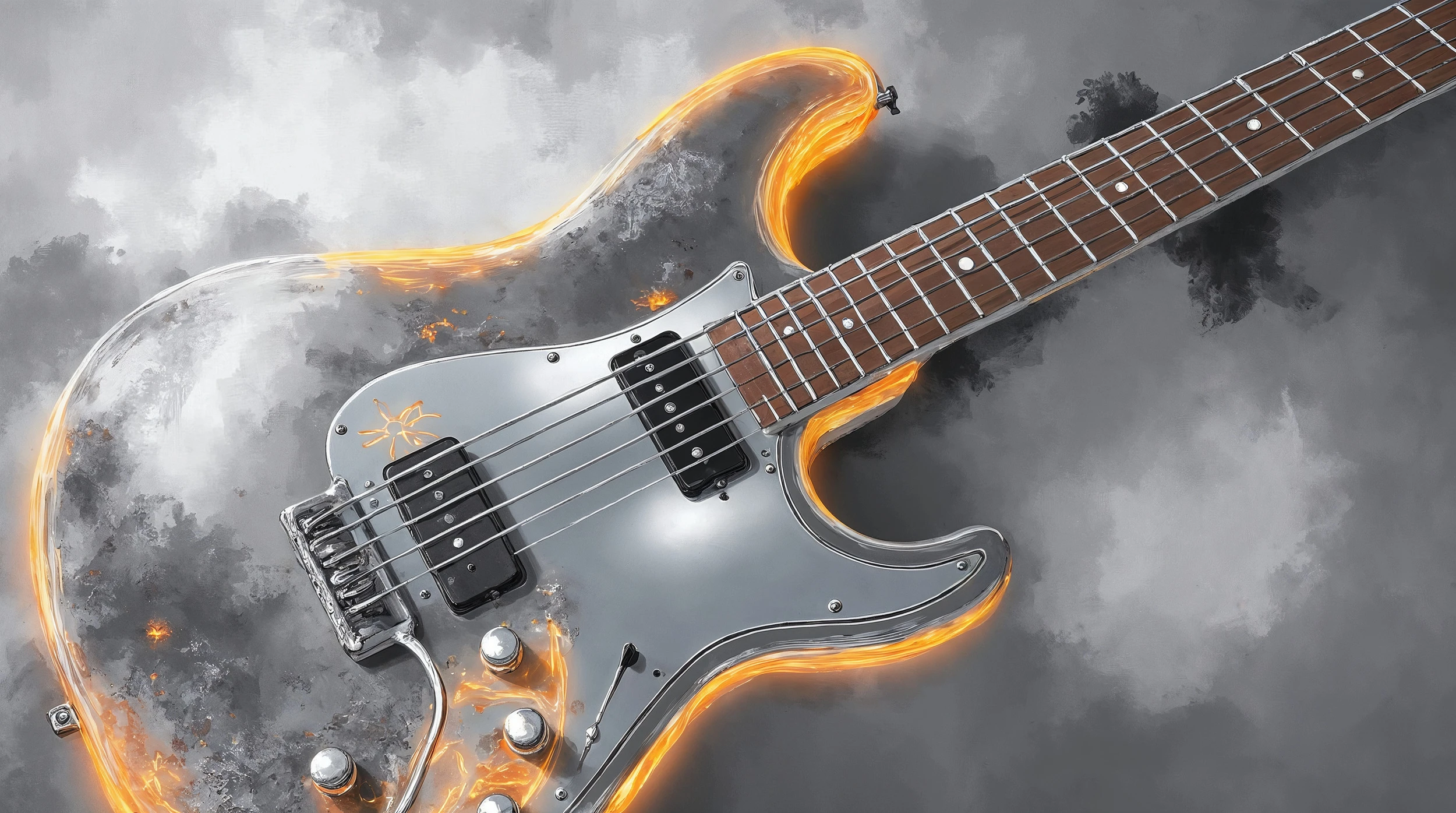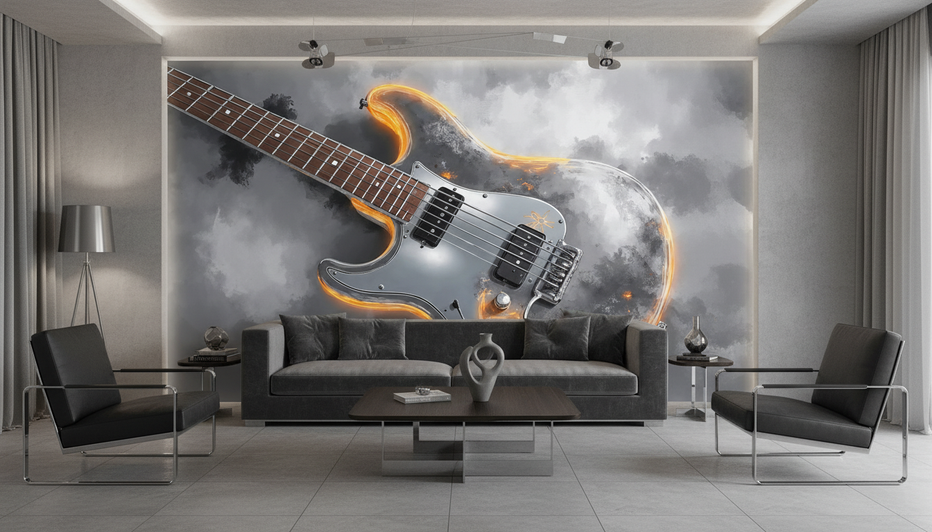 Cette création exceptionnelle révèle une guitare électrique argentée aux reflets métalliques saisissants, magnifiée par des flammes orangées qui dansent autour de sa silhouette iconique. Le manche en bois chaleureux contraste harmonieusement avec le corps chromé de l’instrument, tandis que les micros noirs et les détails argentés apportent une précision technique remarquable. L’ensemble baigne dans un nuage de fumée grise aux volutes mystérieuses, créant une atmosphère dramatique et envoûtante. Ce papier peint rock adopte un style graphique hyperréaliste, mêlant photographie et effets artistiques pour un rendu d’une intensité saisissante.