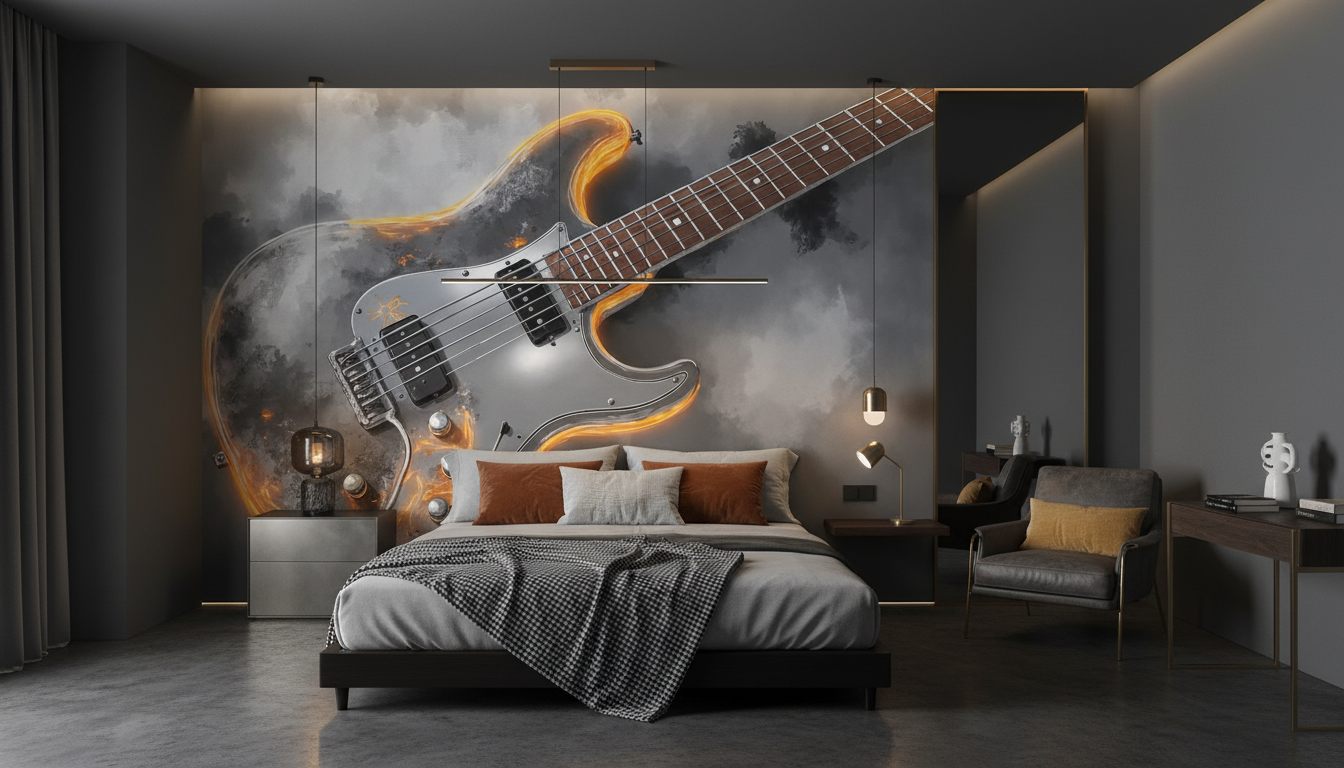 Idéal pour sublimer un studio de musique, ce papier peint trouve également sa place dans une chambre d’adolescent passionné de guitare, un salon moderne au style industriel, ou encore un bureau créatif. Dans une chambre parentale, il créera un mur d’accent saisissant derrière la tête de lit. Associez-le à du mobilier en métal noir, des éléments en cuir vieilli et des accessoires industriels pour renforcer son caractère authentique. Les tons bois brut et les matières texturées comme le béton ciré s’harmoniseront parfaitement avec cette esthétique rock.