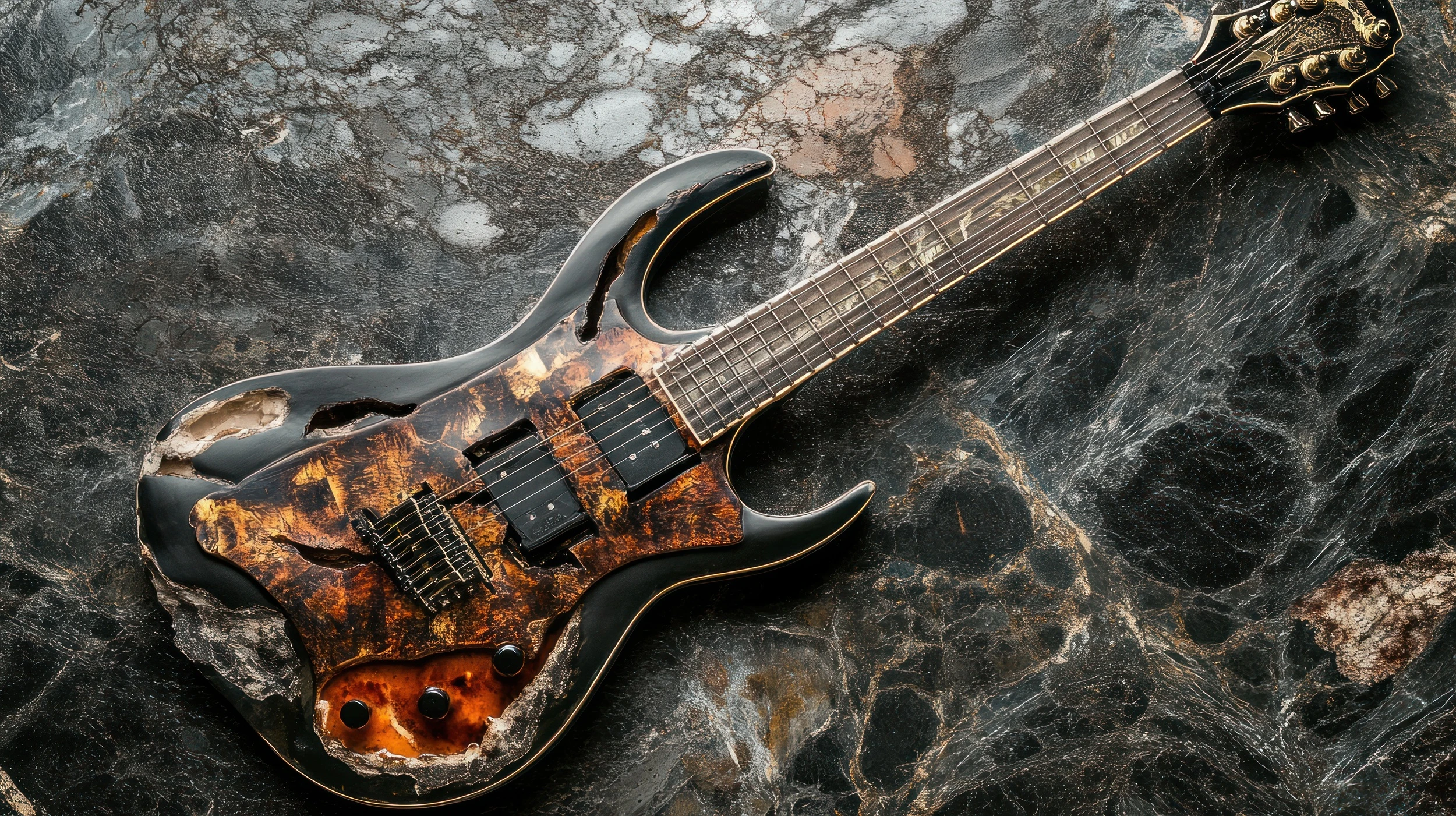Laissez cette guitare pétrifiée résonner sur vos murs, et transformez votre intérieur en sanctuaire dédié à la passion musicale, où chaque regard posé ravive la flamme de la créativité et l’écho éternel du rock.