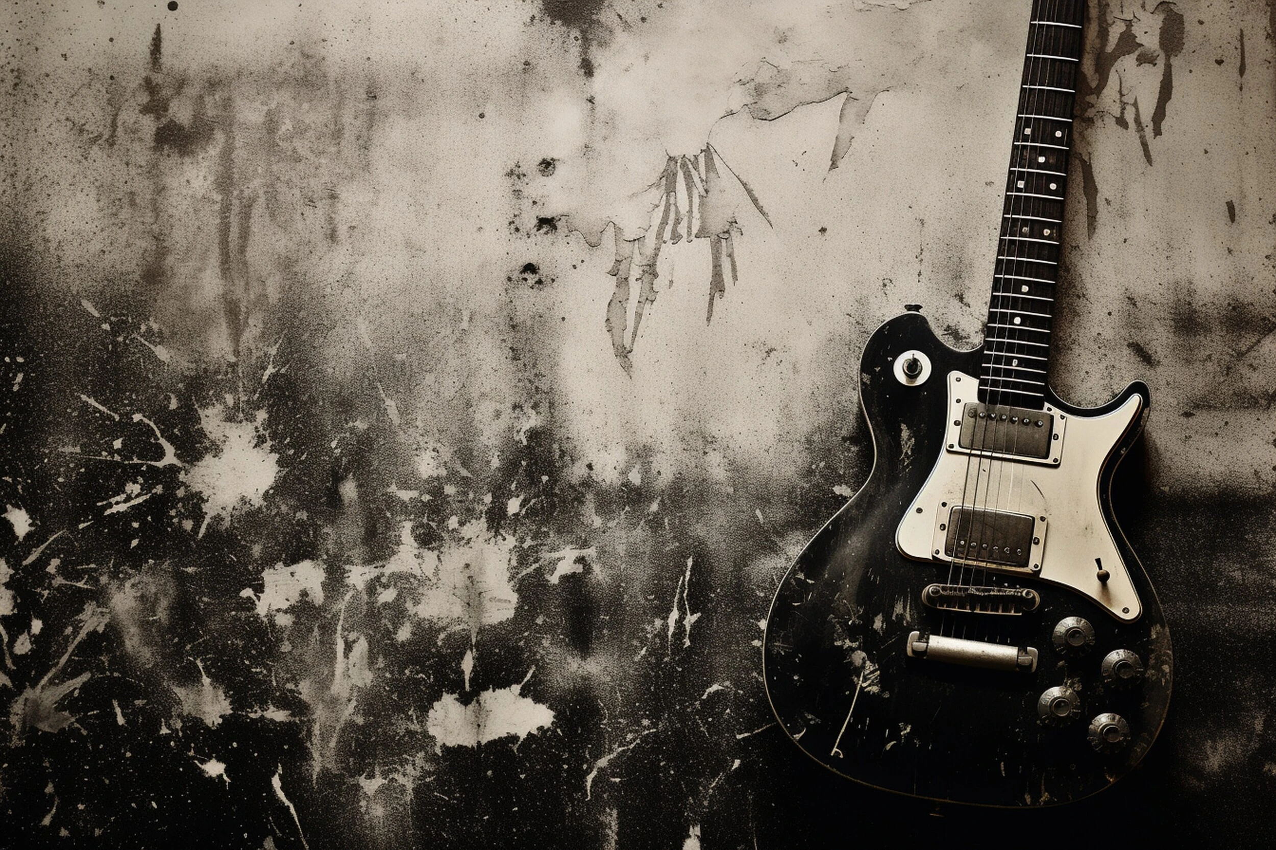 Ce papier peint musical vintage révèle une scène d’une beauté saisissante : une guitare électrique noire aux reflets profonds, délicatement posée contre un mur aux textures usées par le temps. Les nuances sépia et monochrome dominent cette composition, créant une atmosphère de photographie ancienne où chaque détail raconte une histoire. La guitare Les Paul se détache avec élégance, ses pickups blancs et ses cordes métalliques captant subtilement la lumière diffuse. Le mur en arrière-plan, marqué par les stigmates du temps – éclaboussures, fissures et patine -, apporte une authenticité brute qui évoque l’univers des studios d’enregistrement underground et des clubs de rock légendaires.