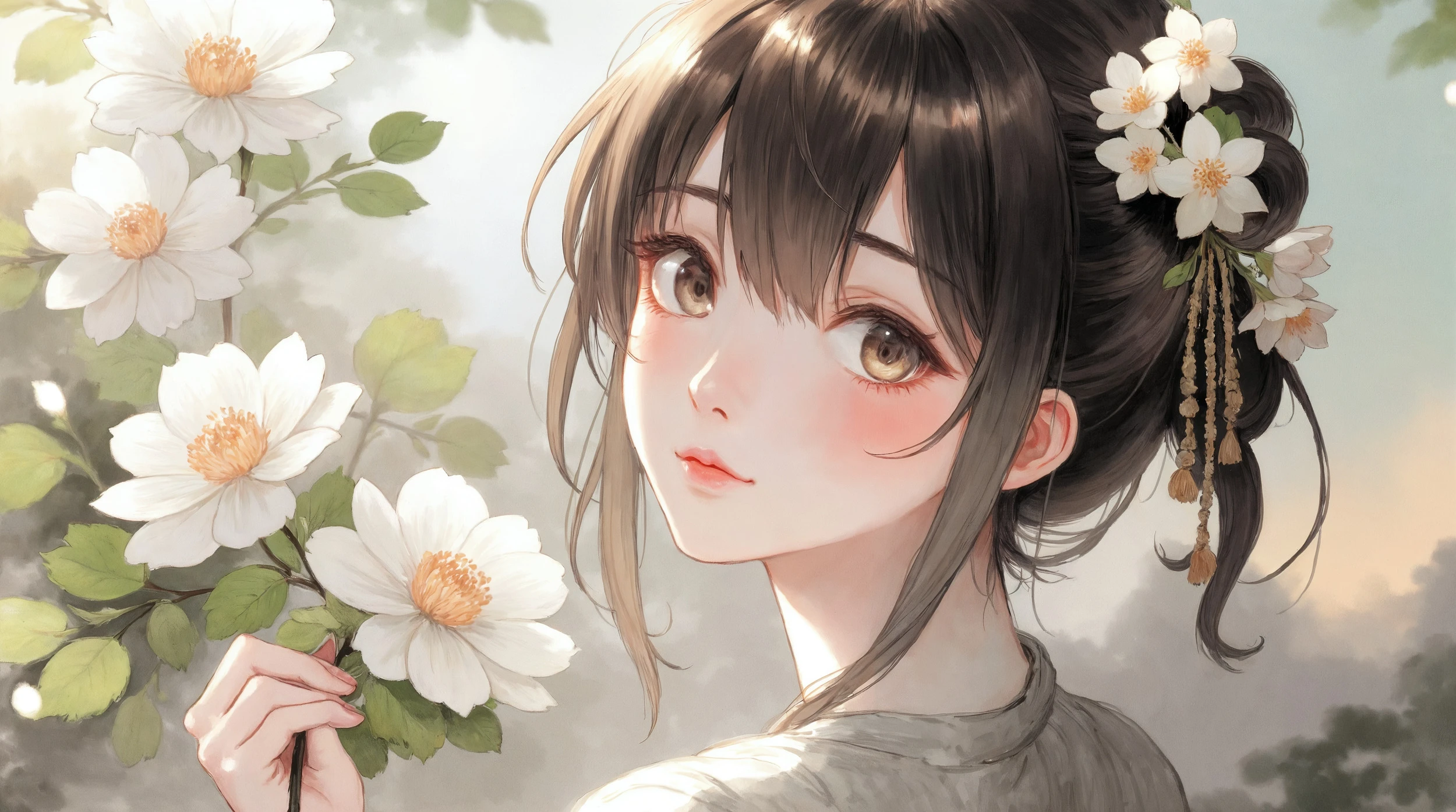 L’artiste a privilégié un style aquarelle numérique d’une finesse remarquable, où chaque détail respire l’authenticité. La palette chromatique douce oscille entre des tons poudrés, des blancs immaculés et des verts tendres, créant une atmosphère apaisante et méditative. L’arrière-plan volontairement flou évoque un jardin japonais baigné de lumière dorée, où les branches fleuries se détachent avec une élégance naturelle.