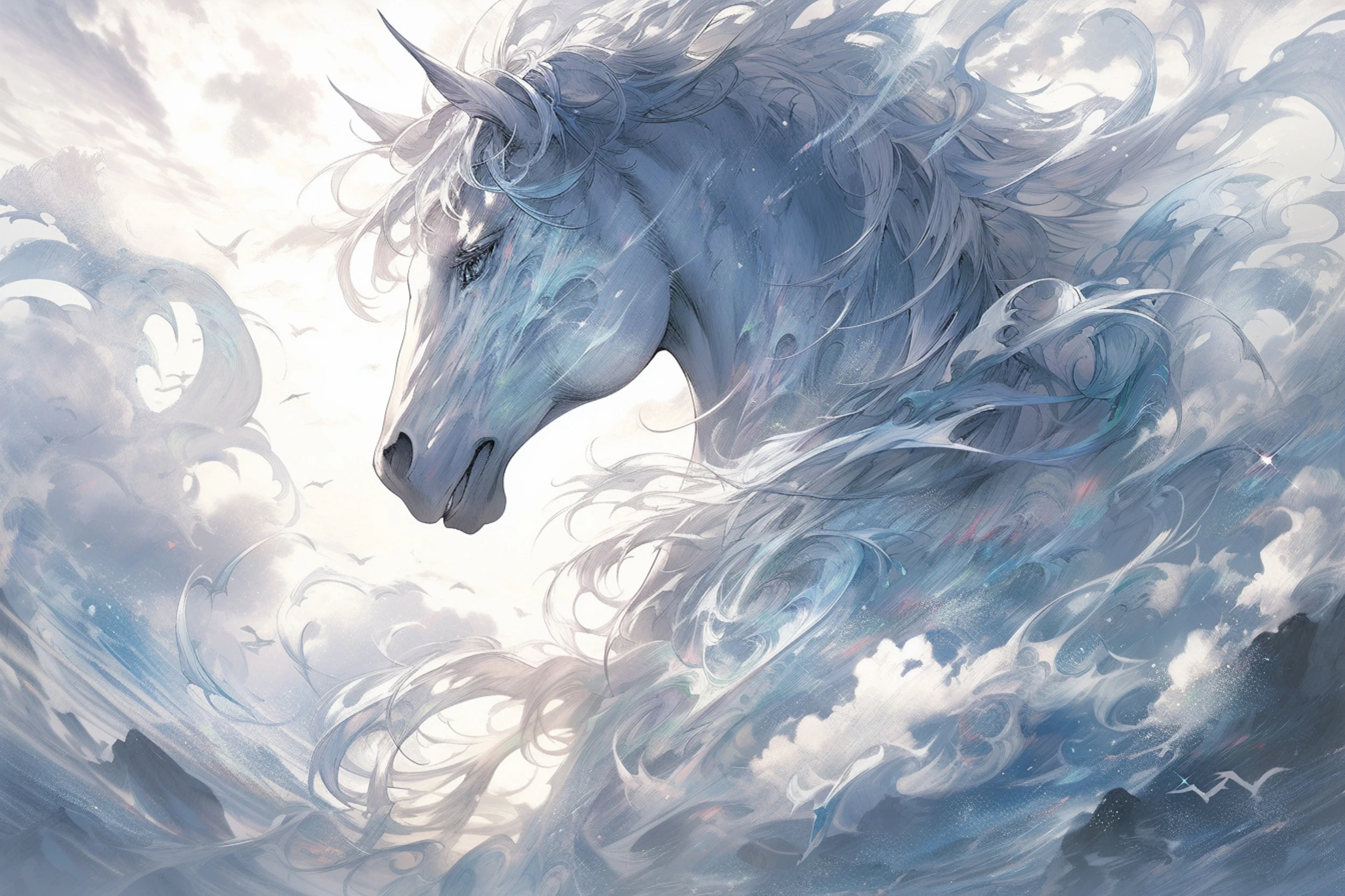 Dans les brumes argentées où la réalité se mêle au mythe, surgit une créature légendaire aux reflets nacrés, portée par les vents célestes dans une danse éternelle entre ciel et nuages.