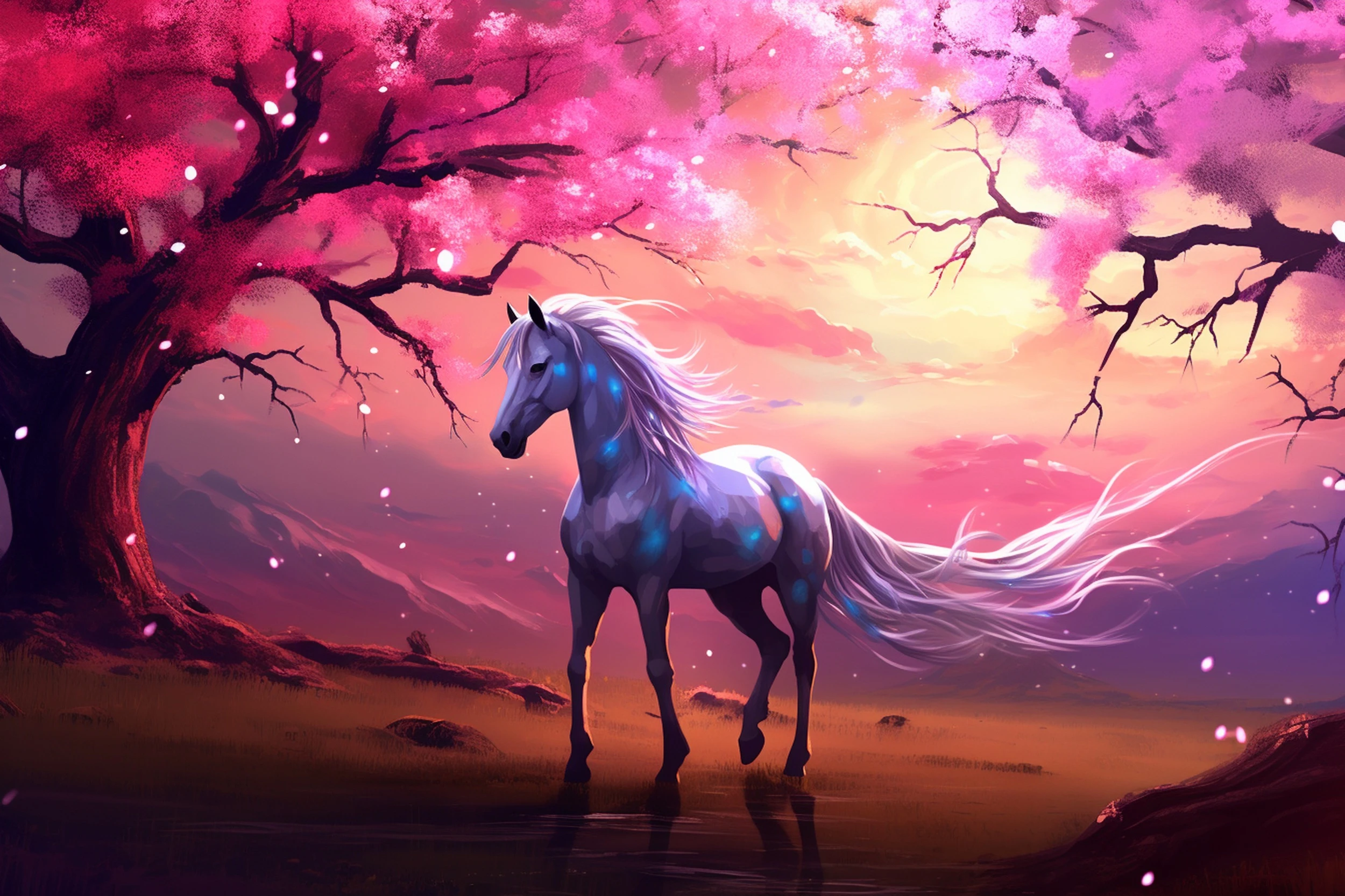Ce papier peint fantasy d’exception révèle un cheval mystique aux reflets violets et bleus, sa crinière nacrée ondoyant dans la brise éternelle d’un paysage onirique. L’animal noble se dresse majestueusement sous des cerisiers en fleurs aux nuances rose fuchsia et magenta, leurs branches délicates créant une voûte protectrice au-dessus de cette scène enchanteresse. Le style graphique, d’un réalisme fantastique saisissant, mêle la précision du dessin numérique à la poésie de l’art japonisant, créant une œuvre d’une intensité visuelle remarquable.