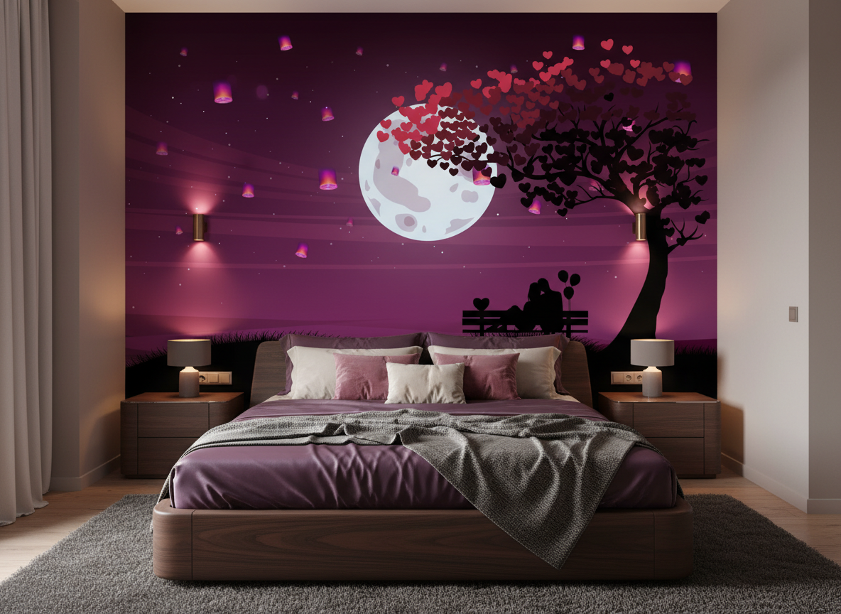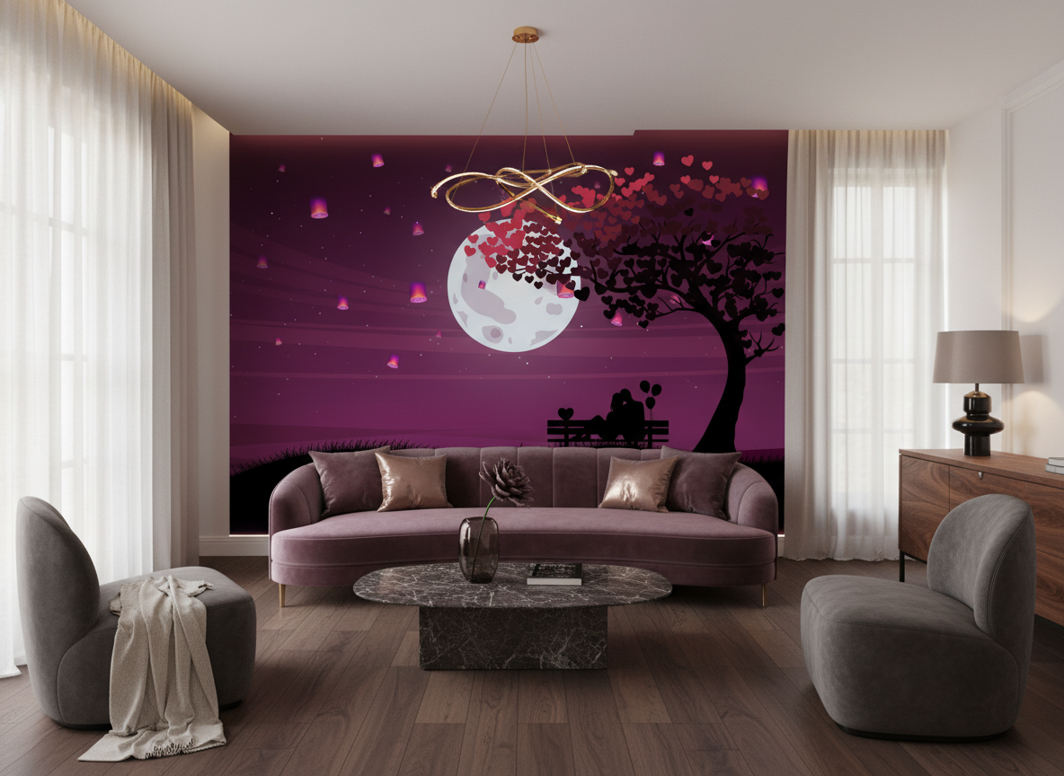 Ce papier peint romantique révèle un paysage onirique d’une beauté envoûtante. Au centre de la composition, une lune pleine aux reflets nacrés illumine délicatement la scène, tandis qu’un arbre aux branches gracieuses se dresse majestueusement sur la droite. Ses feuilles se transforment en une cascade de cœurs roses et rouges qui s’envolent vers l’astre lunaire, créant un mouvement poétique d’une tendresse infinie. Au pied de cet arbre magique, deux silhouettes d’amoureux sont assises sur un banc, contemplant ce spectacle féerique. Le style graphique, aux influences illustration numérique contemporaine, marie subtilement réalisme et fantaisie. La palette chromatique oscille entre des violets profonds, des roses tendres et des noirs veloutés, ponctuée de touches lumineuses qui évoquent un crépuscule enchanteur.