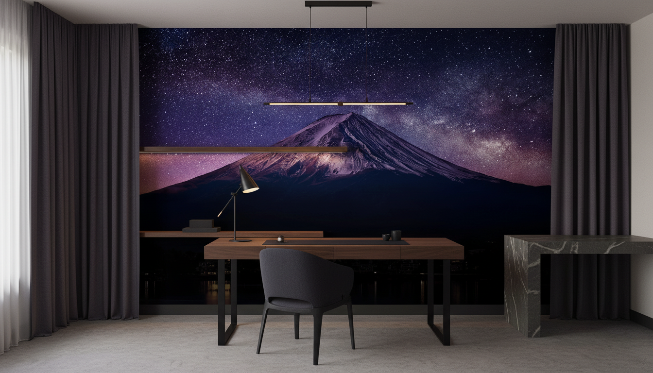 Ce papier peint paysage nocturne capture avec une précision photographique la splendeur du célèbre volcan japonais se dressant fièrement sous un ciel constellé d’étoiles scintillantes. La Voie lactée déploie ses bras lumineux dans des nuances de violet profond, rose poudré et bleu indigo, créant un dégradé cosmique d’une rare intensité. Au premier plan, les eaux paisibles d’un lac reflètent discrètement quelques lumières dorées, témoins silencieux de la vie humaine nichée au pied de cette merveille naturelle.