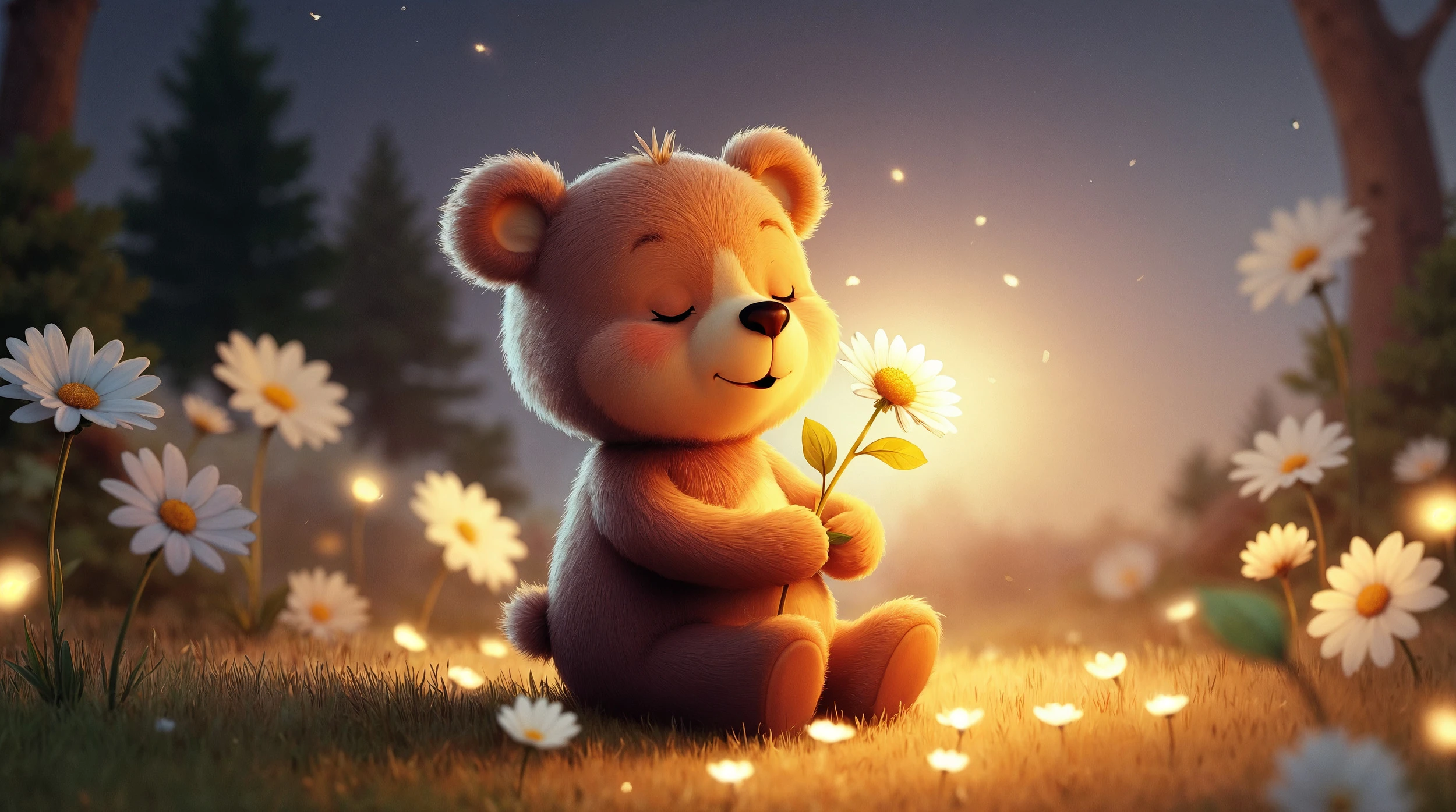 Au cœur de cette composition délicate, un adorable ourson en peluche aux teintes caramel et miel trône paisiblement dans une prairie parsemée de marguerites blanches. Ses yeux clos expriment une sérénité touchante tandis qu’il tient délicatement une fleur lumineuse entre ses pattes douillettes. L’illustration 3D hyperréaliste révèle chaque détail avec une précision saisissante : la texture soyeuse de son pelage, les reflets dorés qui caressent son museau, et cette expression de bonheur pur qui émane de son petit visage.