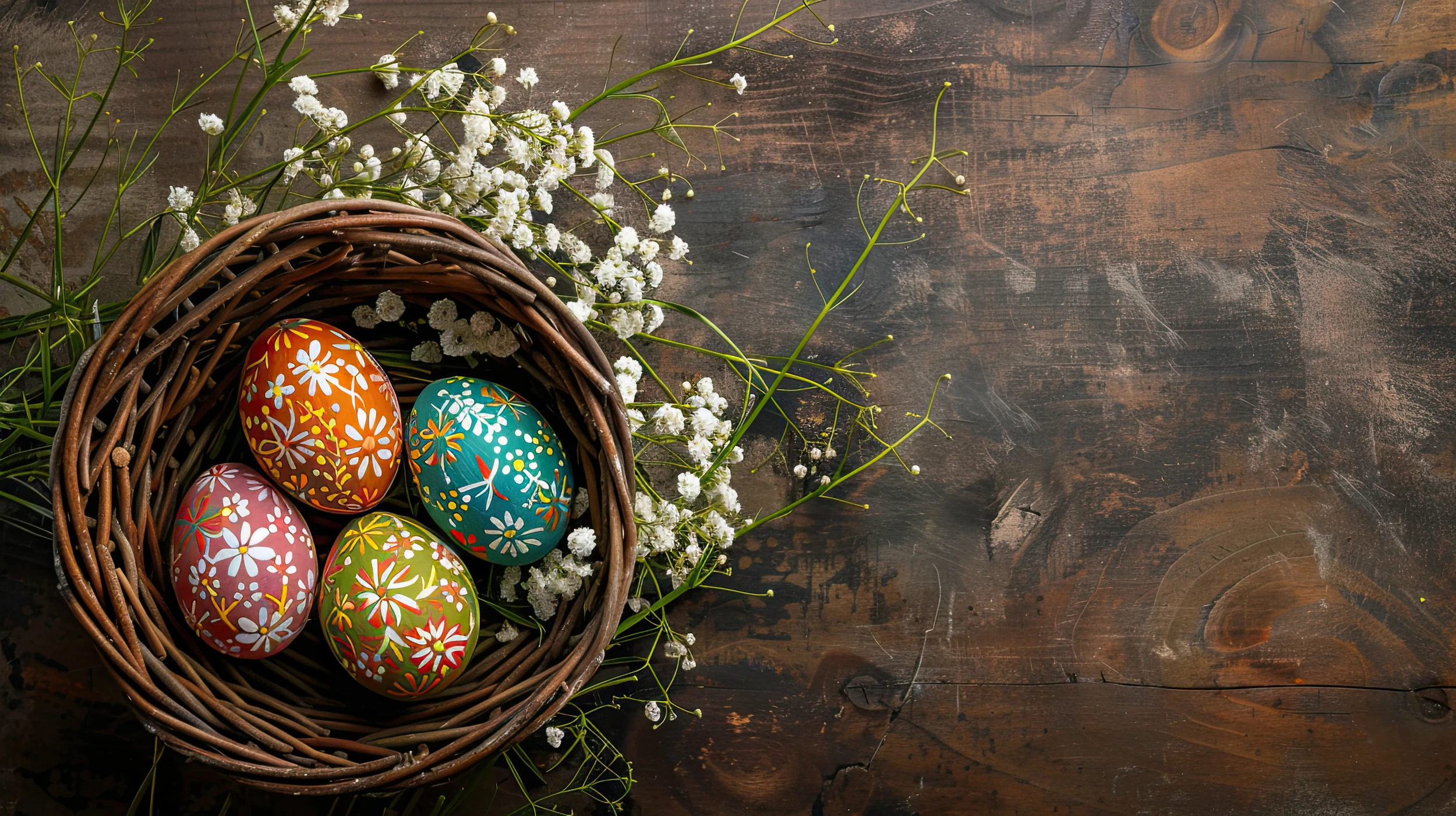 Ce papier peint décoratif Pâques révèle un panier d’osier tressé aux teintes caramel, délicatement niché dans un écrin de gypsophile blanc aux mille petites étoiles perlées. Quatre œufs de Pâques ornementés s’épanouissent dans cette corbeille artisanale : un rouge vermillon aux motifs floraux blancs, un rose tendre paré de délicates marguerites, un vert olive vibrant décoré de compositions végétales stylisées, et un bleu canard profond sublimé par des arabesques dorées. Le style graphique traditionnel de ces décorations évoque l’art populaire européen, mêlant influences slaves et germaniques dans un rendu artisanal authentique.
