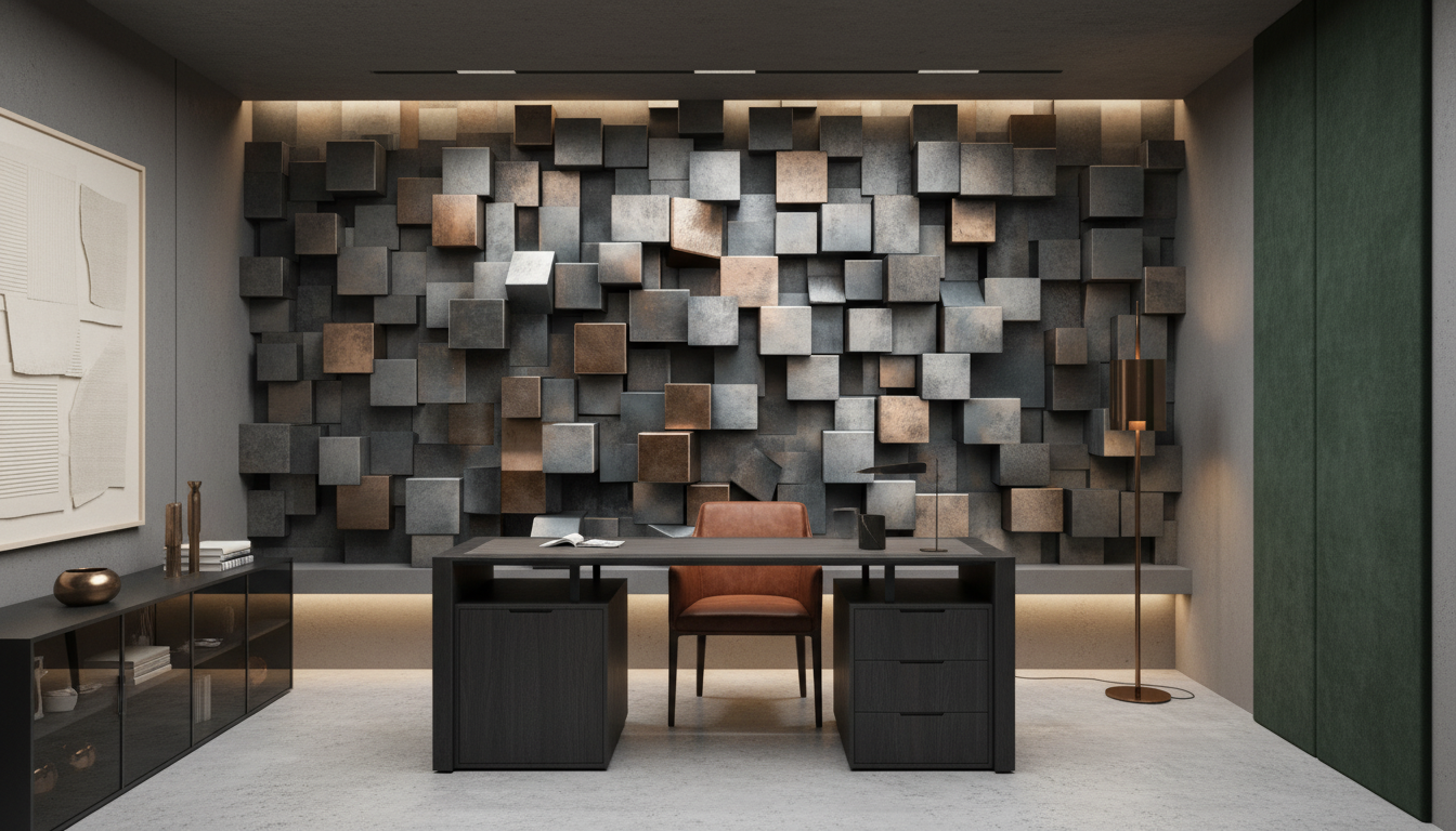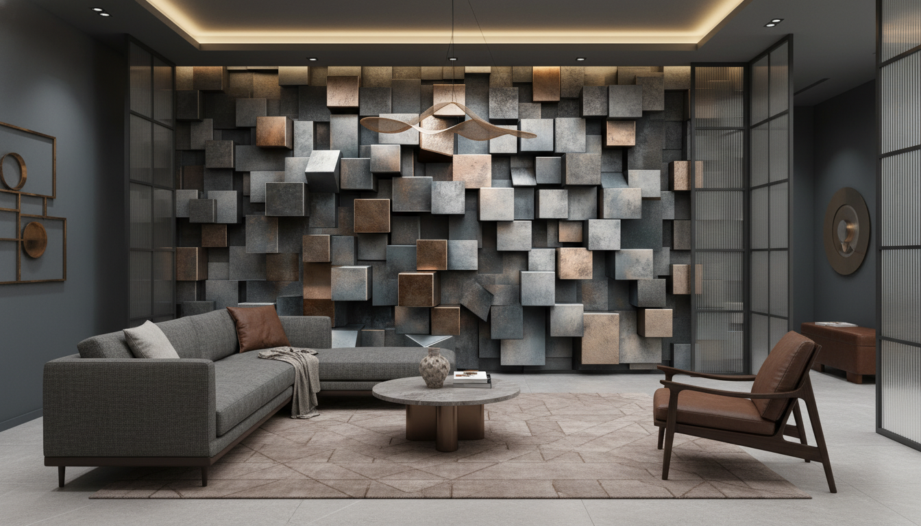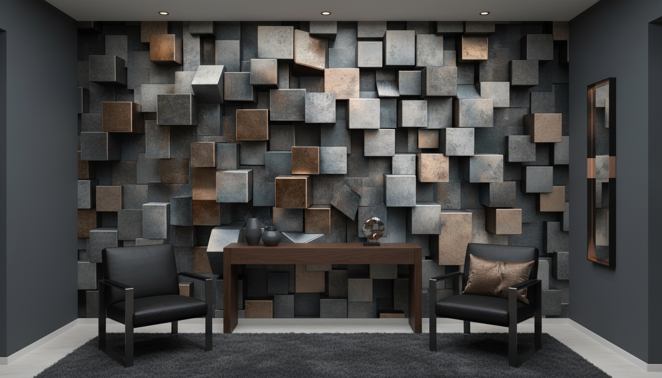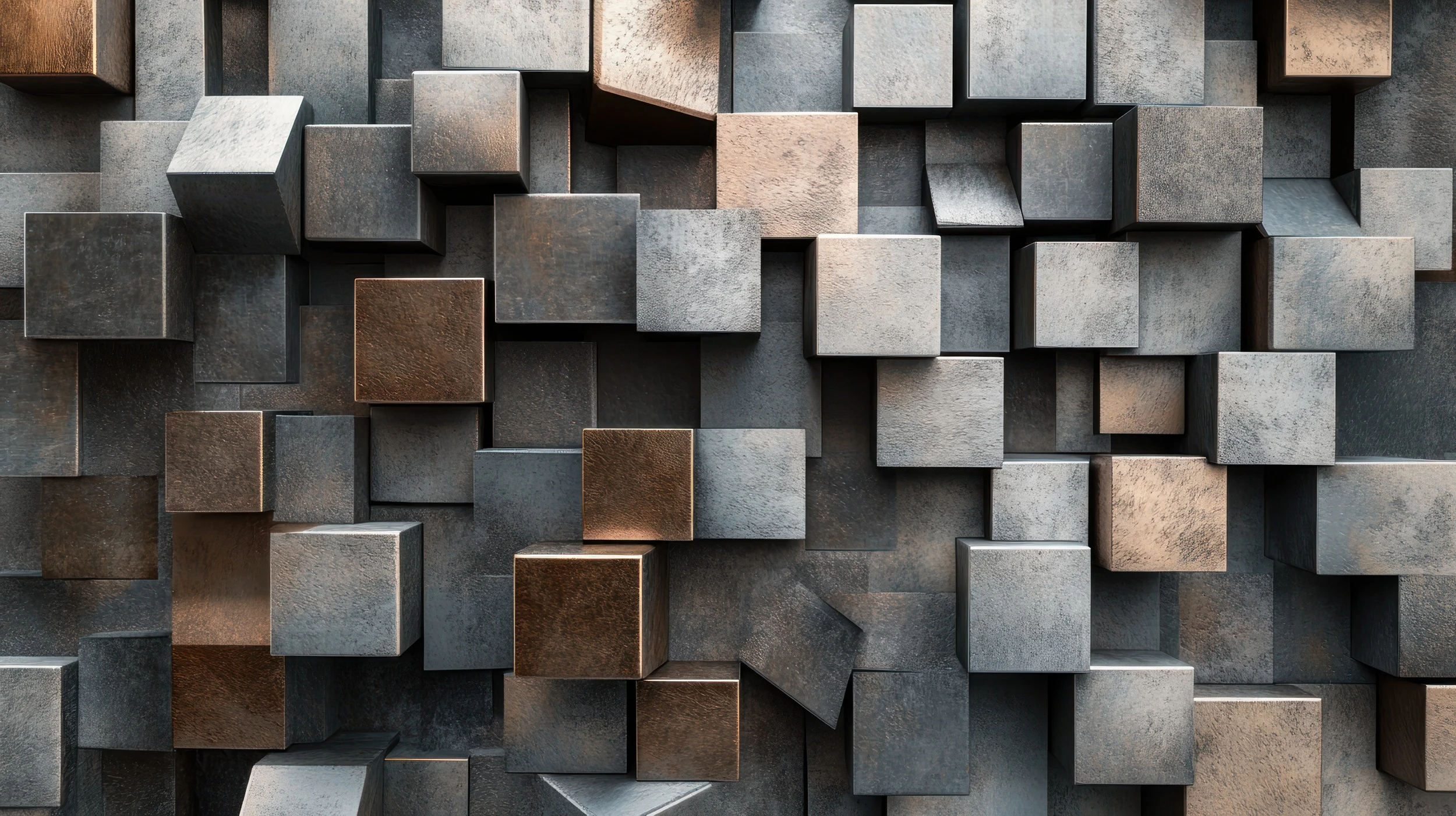 Cette création graphique époustouflante présente une composition de cubes métalliques aux finitions variées, alternant entre surfaces grises anthracite, cuivrées et bronze patiné. Chaque élément géométrique semble s’échapper du mur, créant un relief tridimensionnel d’un réalisme troublant. Les textures métalliques captent et reflètent la lumière de manière subtile, conférant à l’ensemble une dimension industrielle raffinée. Les tons neutres – du gris acier au beige minéral en passant par les reflets cuivrés – s’harmonisent pour créer une palette sophistiquée et intemporelle.