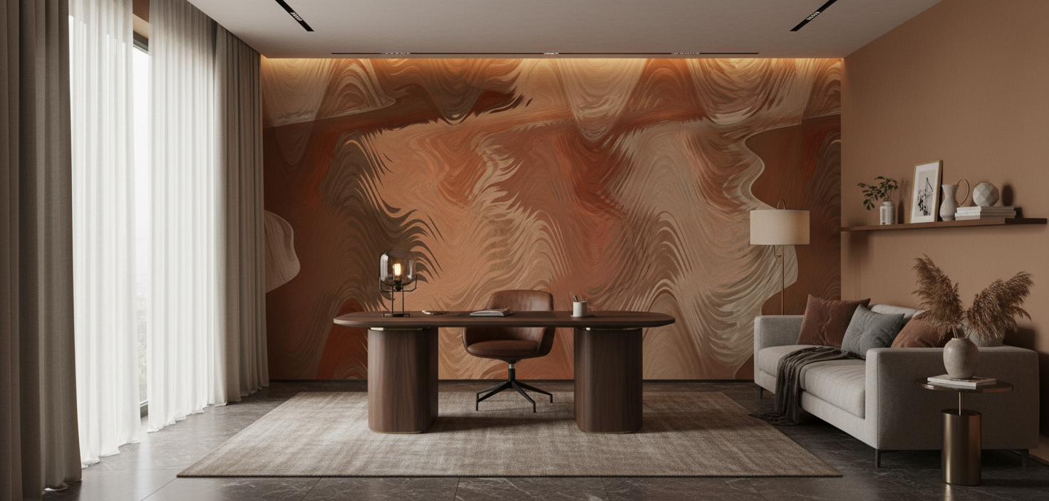 Créez une ambiance d’exception avec ce papier peint abstrait fluide. Ses ondes cuivrées et dorées apportent luxe et profondeur. Design sur mesure pour une décoration murale raffinée et unique.