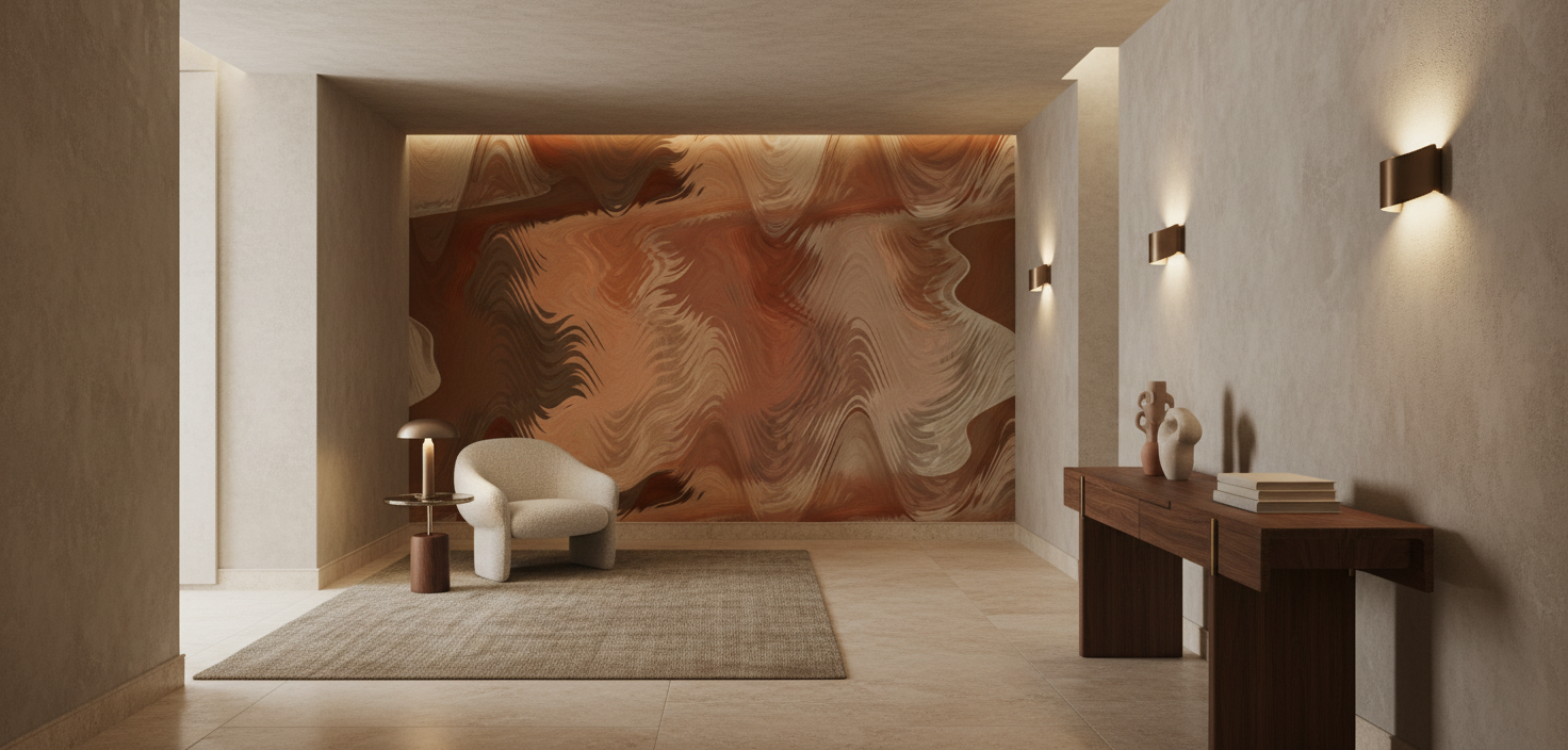 Ce papier peint contemporain révèle un motif fluide d’une beauté saisissante, où les tons chauds de cuivre, d’ambre doré et de terre de Sienne s’entremêlent dans des vagues organiques. Les courbes sensuelles évoquent tantôt les stries d’un bois précieux, tantôt les méandres d’une rivière dorée captant les derniers rayons du soleil couchant. Cette décoration murale abstraite joue avec la lumière grâce à ses effets de matière subtils, créant une profondeur visuelle fascinante qui transforme chaque regard en voyage contemplatif.