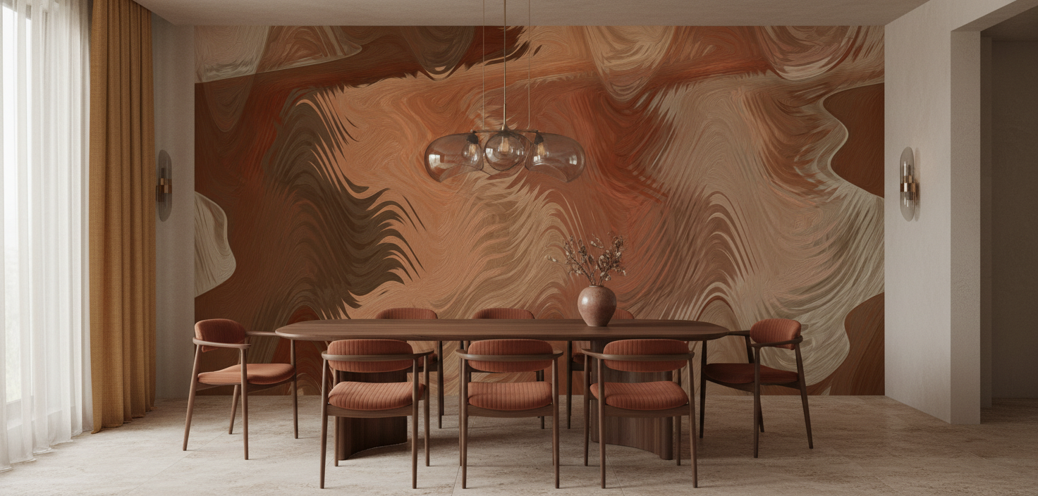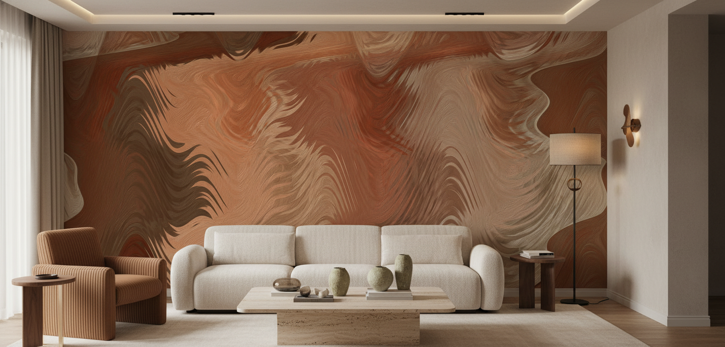 Papier Peint Abstract Fluide aux Tons Cuivrés et Dorés